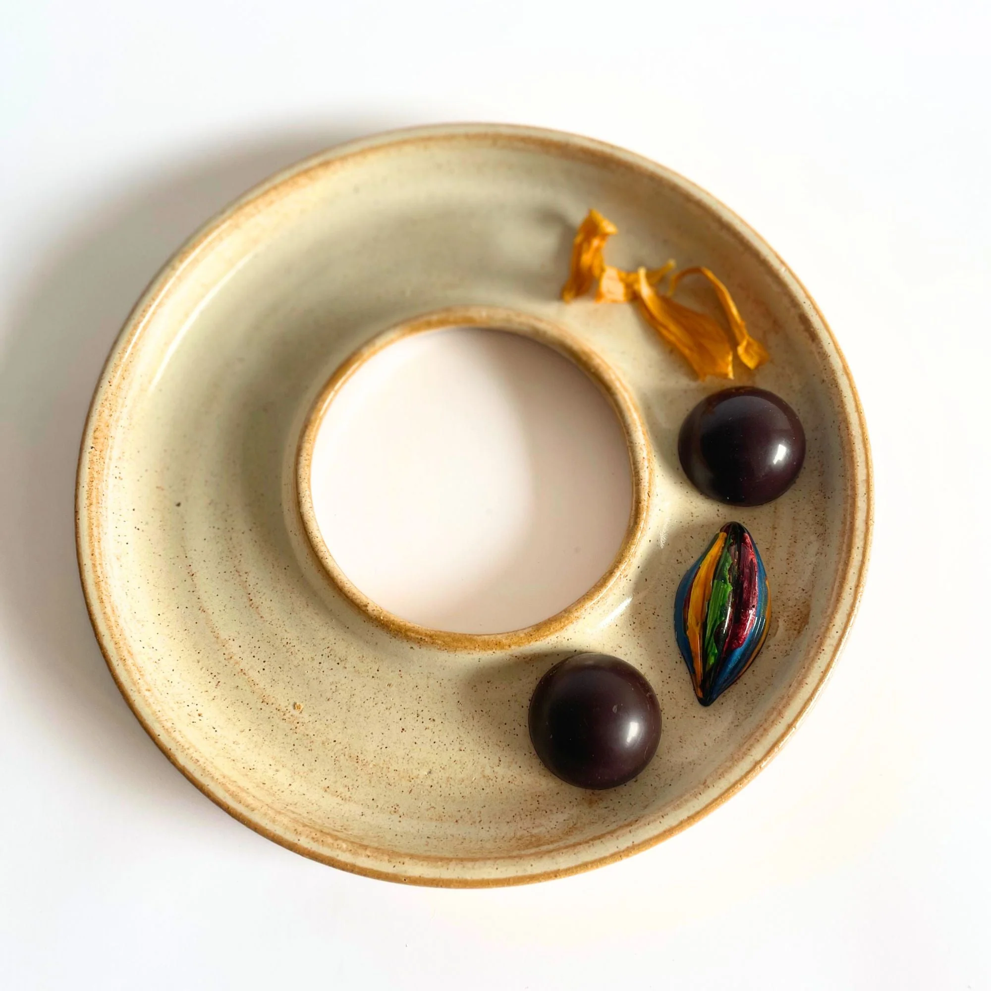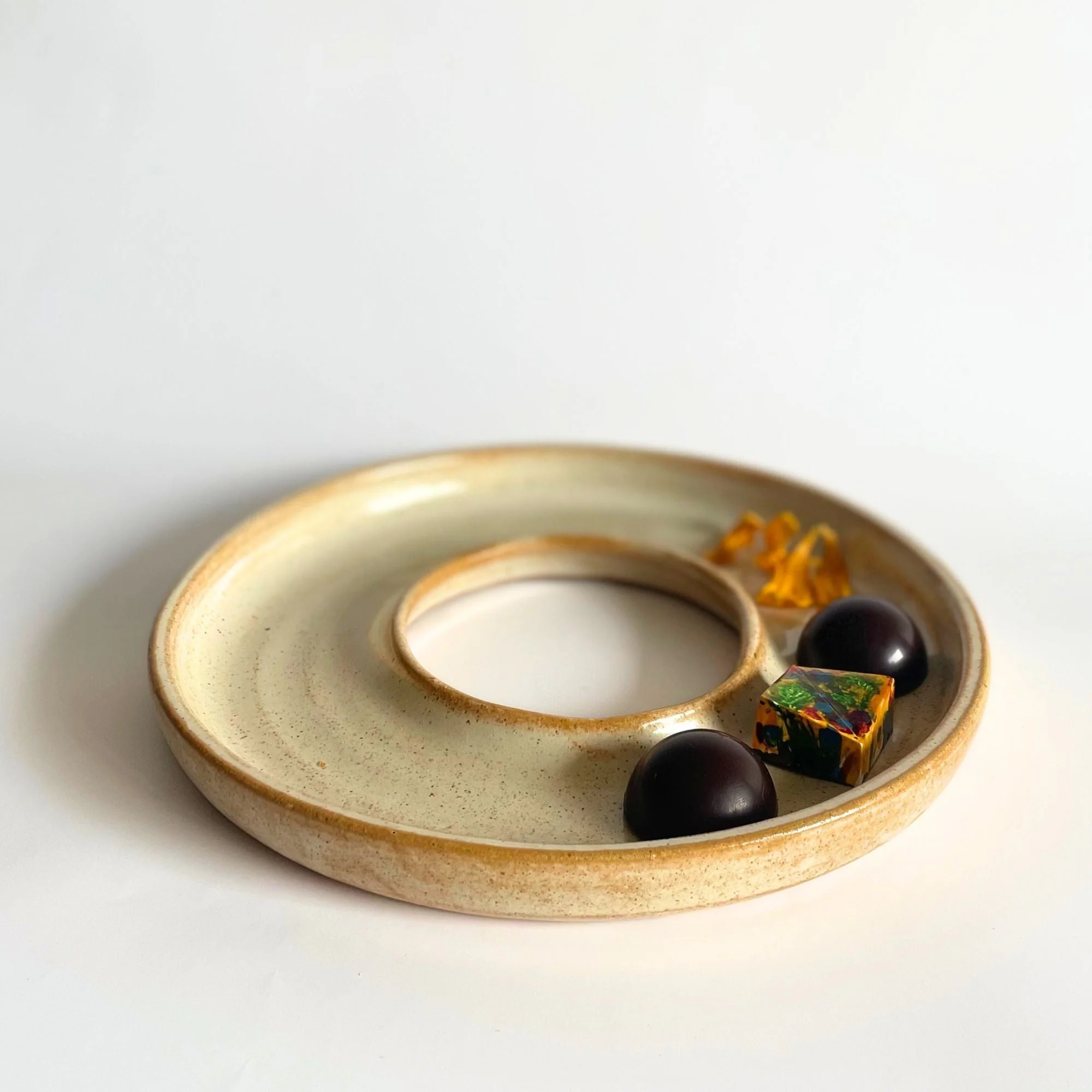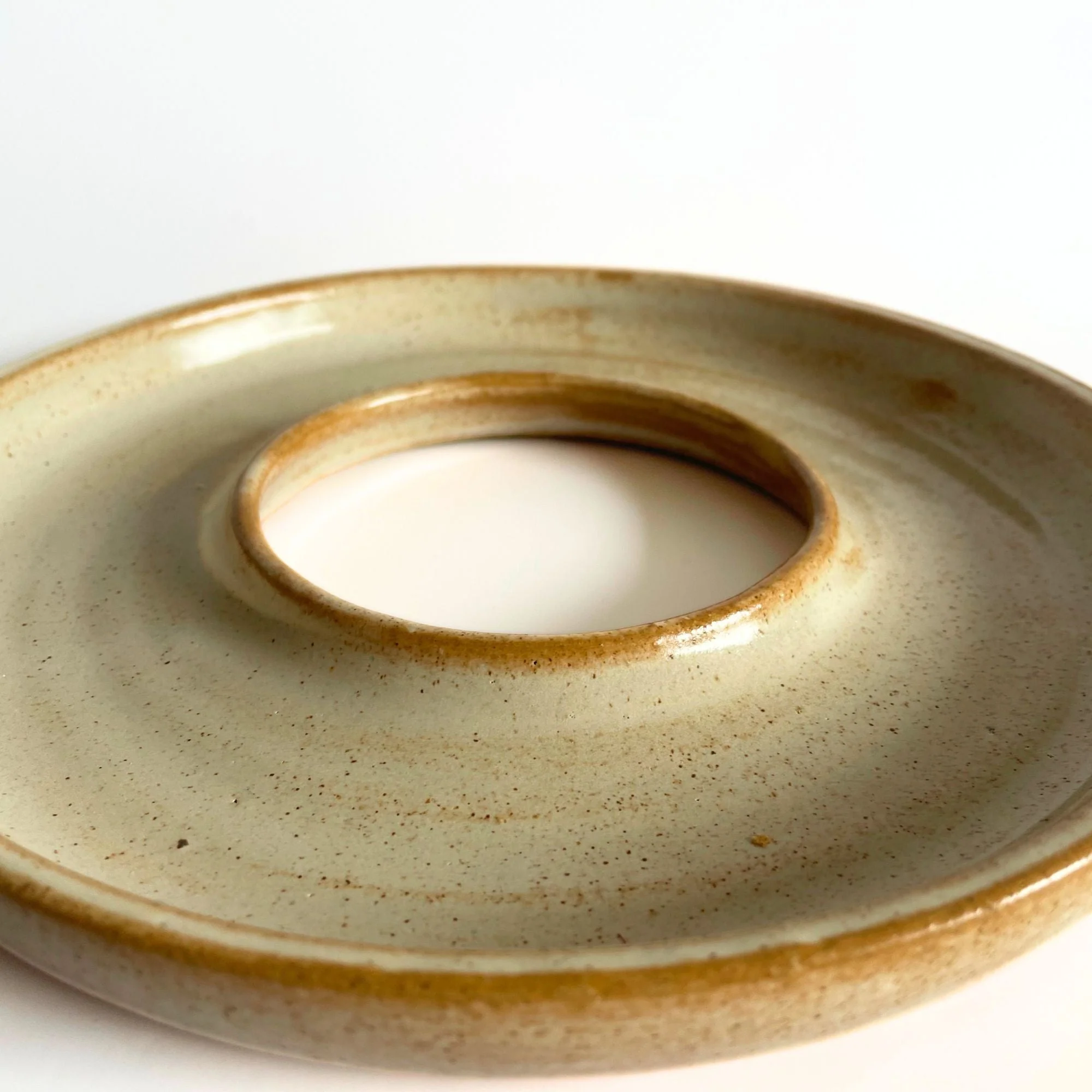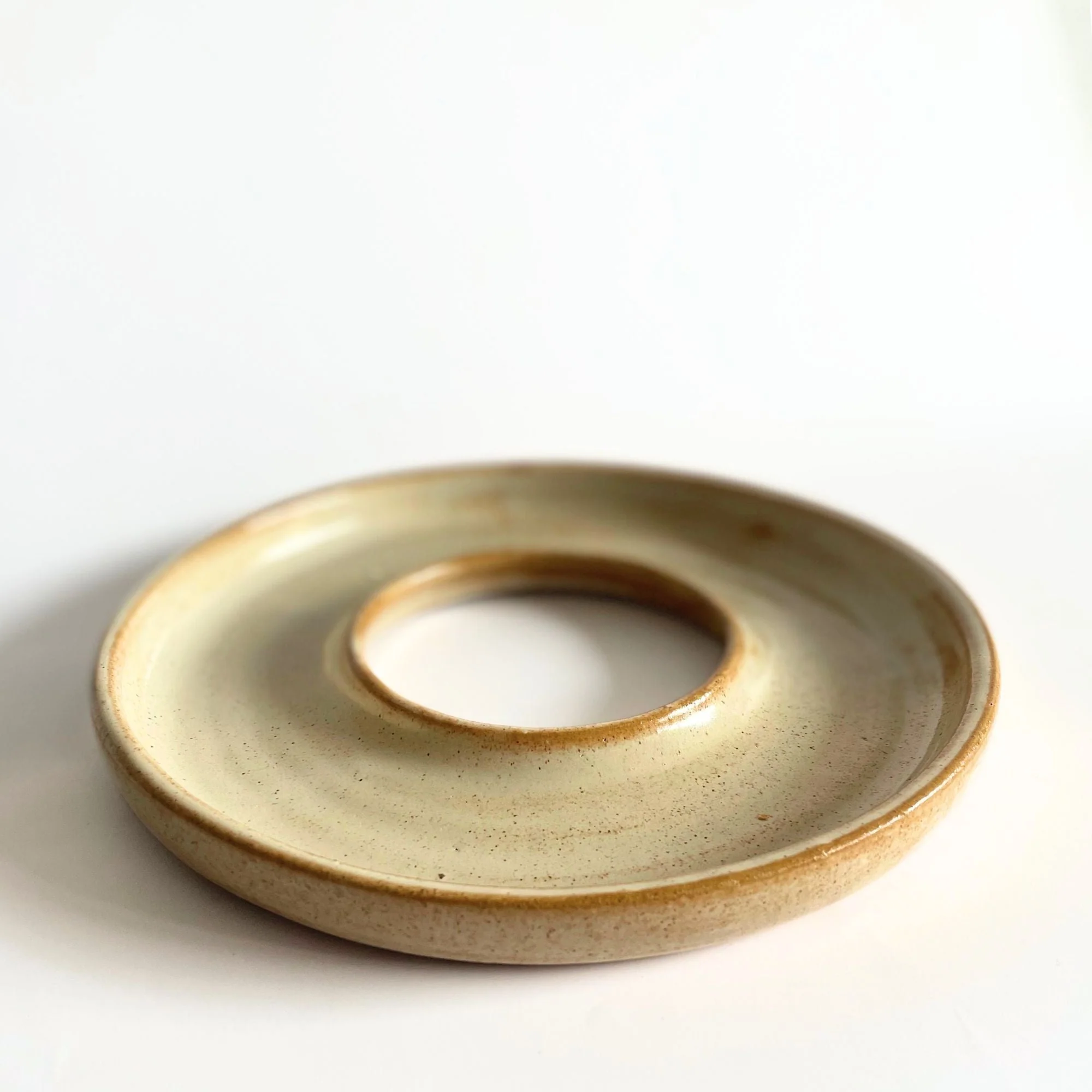 Patena: plato con forma de halo. Con un diámetro total de 22 cm. Su ancho, medido desde el borde exterior hacia el centro, es de 6 cm. En la parte central del plato, presenta un espacio vacío de 9cm. «Ritual» es una línea exclusiva de piezas y platos en cerámica de gres, elaborados de forma artesanal, con inspiración en objetos litúrgicos y ceremoniales. Esta interpretación del ritual llevado a la mesa, se convierte en lienzo ideal para servir una amplia variedad de platos, desde entradas y ensaladas hasta platos principales y postres. Cada objeto es hecho a mano uno por uno en nuestro taller, al igual que los esmaltes. Es por esto que pueden existir pequeñas variaciones entre los tamaños, formas y colores.