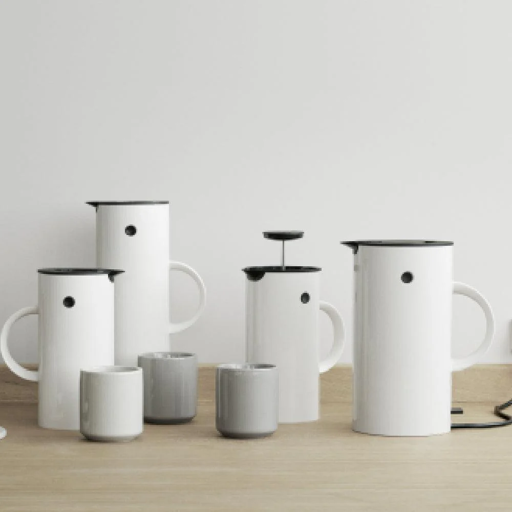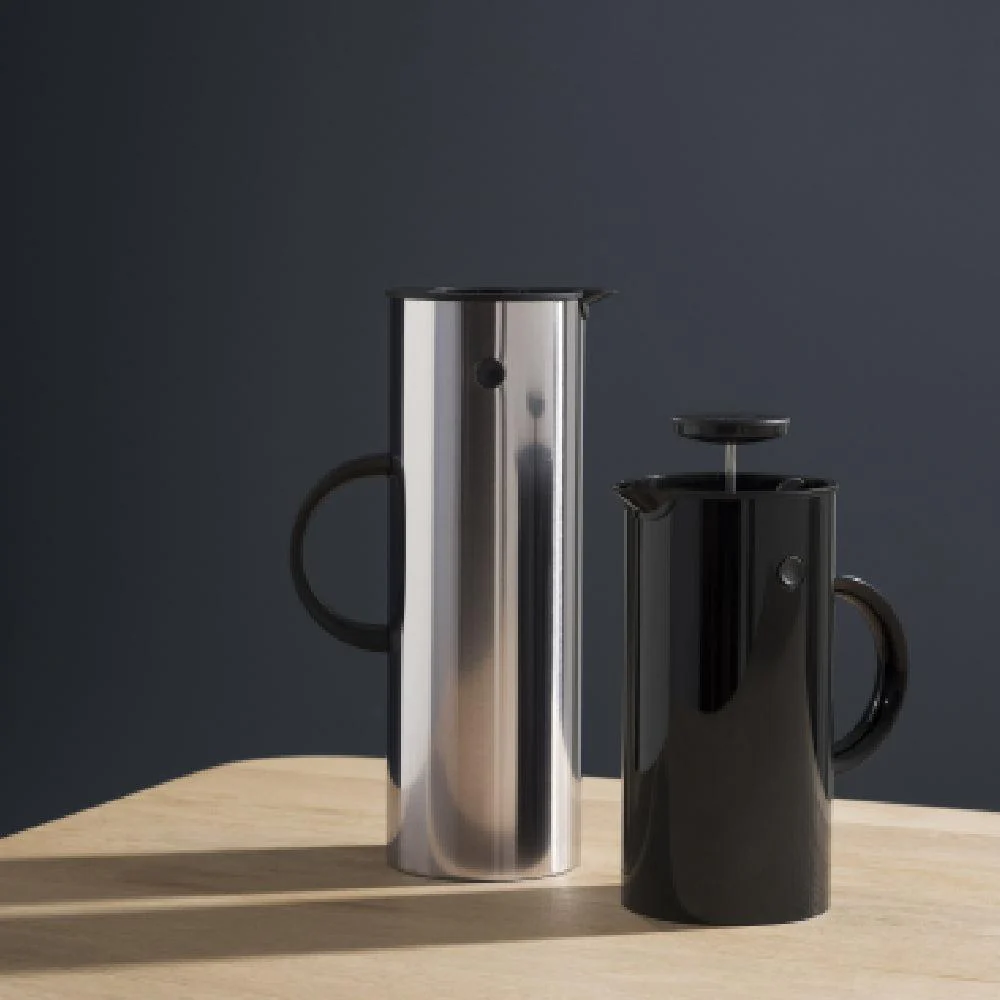 En el mismo lenguaje simple que la jarra de vacío EM77, la cafetera de prensa EM tiene capacidad para ocho tazas y sus paredes dobles mantienen el café caliente por más tiempo. Gire la tapa para verter el café y vuelva a girarla para cerrar. Los diseños de Erik Magnussen se exhiben en museos de todo el mundo y recibió el Premio Lunning en 1967 y el Premio Furniture en 1977. En 1983 fue elegido \\»diseñador del año\\» por el Danish Design Council y sus productos han recibido varias veces el premio Premio ID de la Sociedad Danesa de Diseño Industrial.