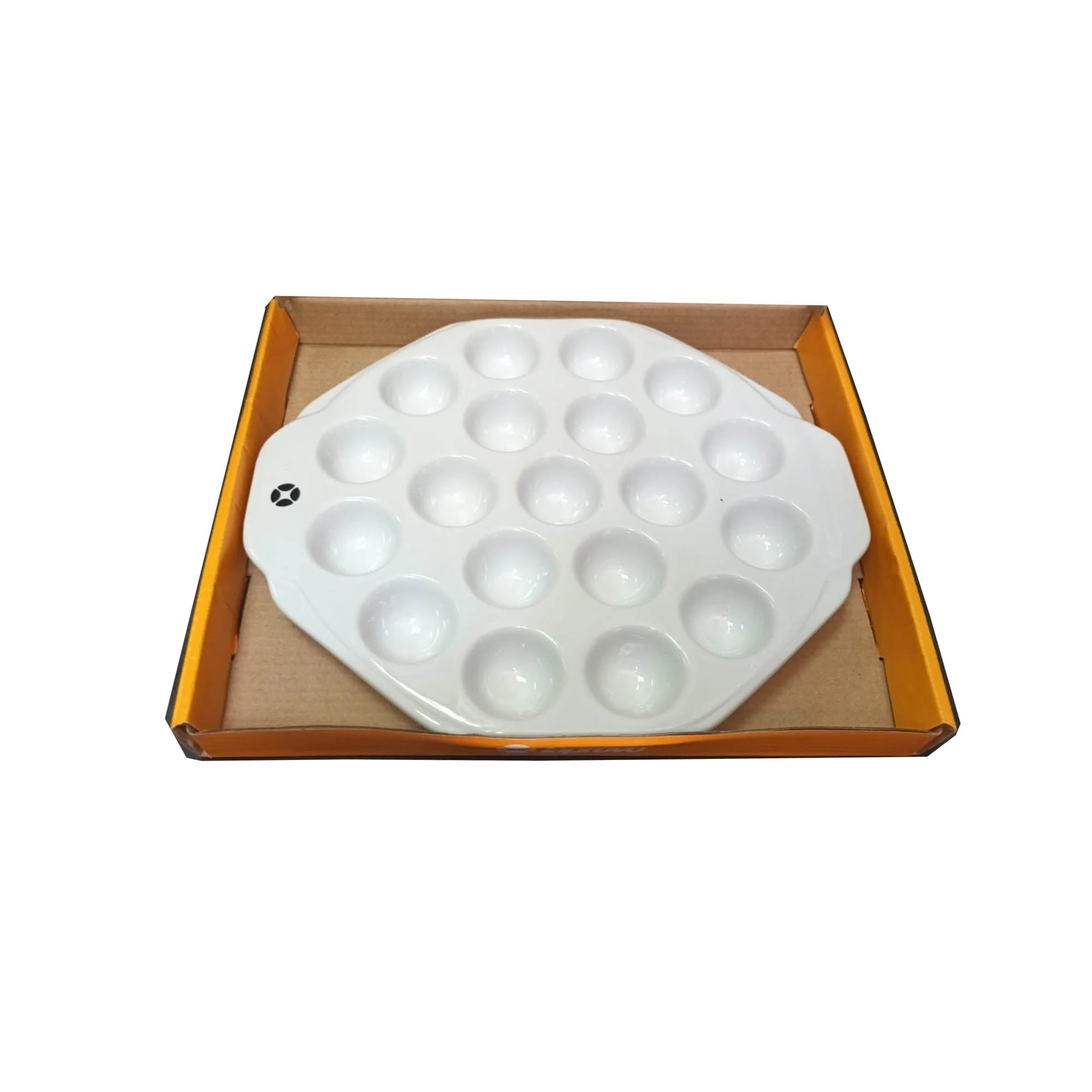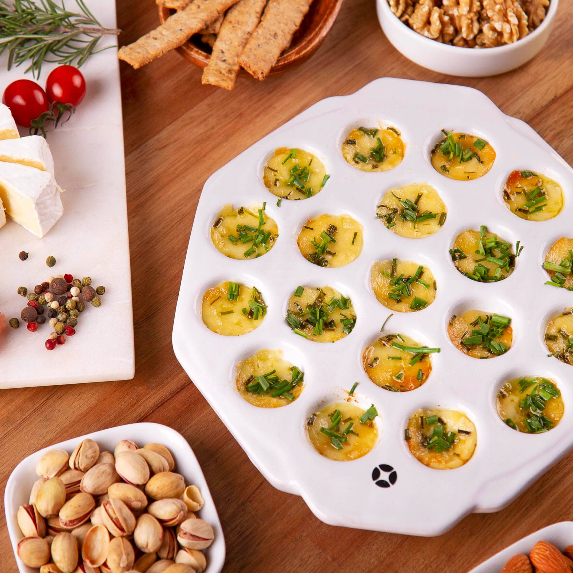 Plato provoletero de 19 cavidades, de marca Laprovo, reconocida marca uruguaya, líder del rubro. En cerámica color terracota o blanco. De fácil limpieza y apta para lavavajillas, es ideal para el rubro gastronómico, dándole un gran valor agregado a la carta de entradas y aperitivos. Es fabricado con una minuciosa combinación de caolines, arcillas y cuarzos, tratadas con esmaltes alcalinos no plúmbicos (sin plomo) y libres de cadmio.