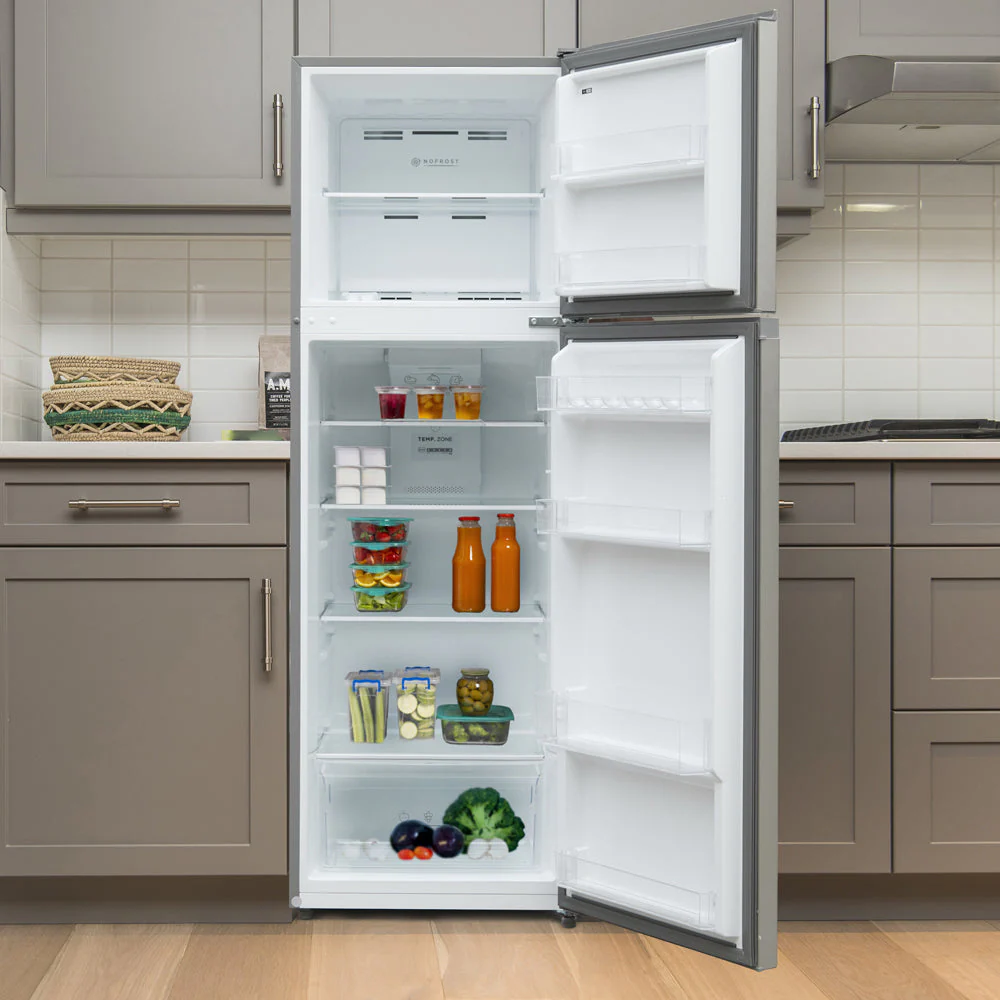 El Refrigerador Kubli Neu No Frost combina funcionalidad y diseño elegante. Con instalación free standing y puertas reversibles, se adapta a cualquier espacio. La función No Frost y el control de temperatura electrónico aseguran un rendimiento óptimo sin necesidad de descongelar manualmente. Ofrece un volumen útil de 266 litros, con iluminación LED para una visibilidad clara. Sus repisas de vidrio y el cajón para verduras con control de humedad, mantienen los alimentos frescos por más tiempo. Incluye un estante en la puerta para botellas de 2 litros, optimizando el espacio interior.