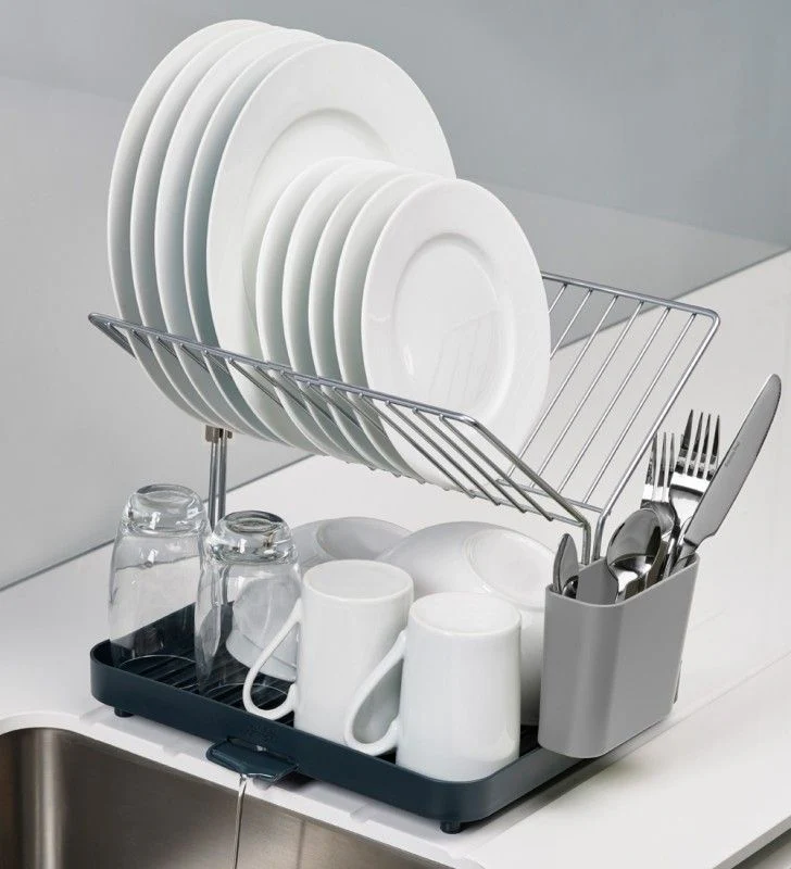 El Secaplatos y Rack Gris de Joseph Joseph es una solución práctica y elegante para secar tu vajilla. Su base firme permite secar ollas, sartenes, tazas y bowls, mientras que el rack metálico superior puede sostener hasta 15 platos. Incluye un compartimiento lateral para cubiertos y utensilios, y su diseño con surcos en ángulo facilita el drenaje del agua a través de la boquilla directamente al lavaplatos. Ideal para mantener tu cocina organizada y libre de agua acumulada, combina funcionalidad y estilo en un solo producto.