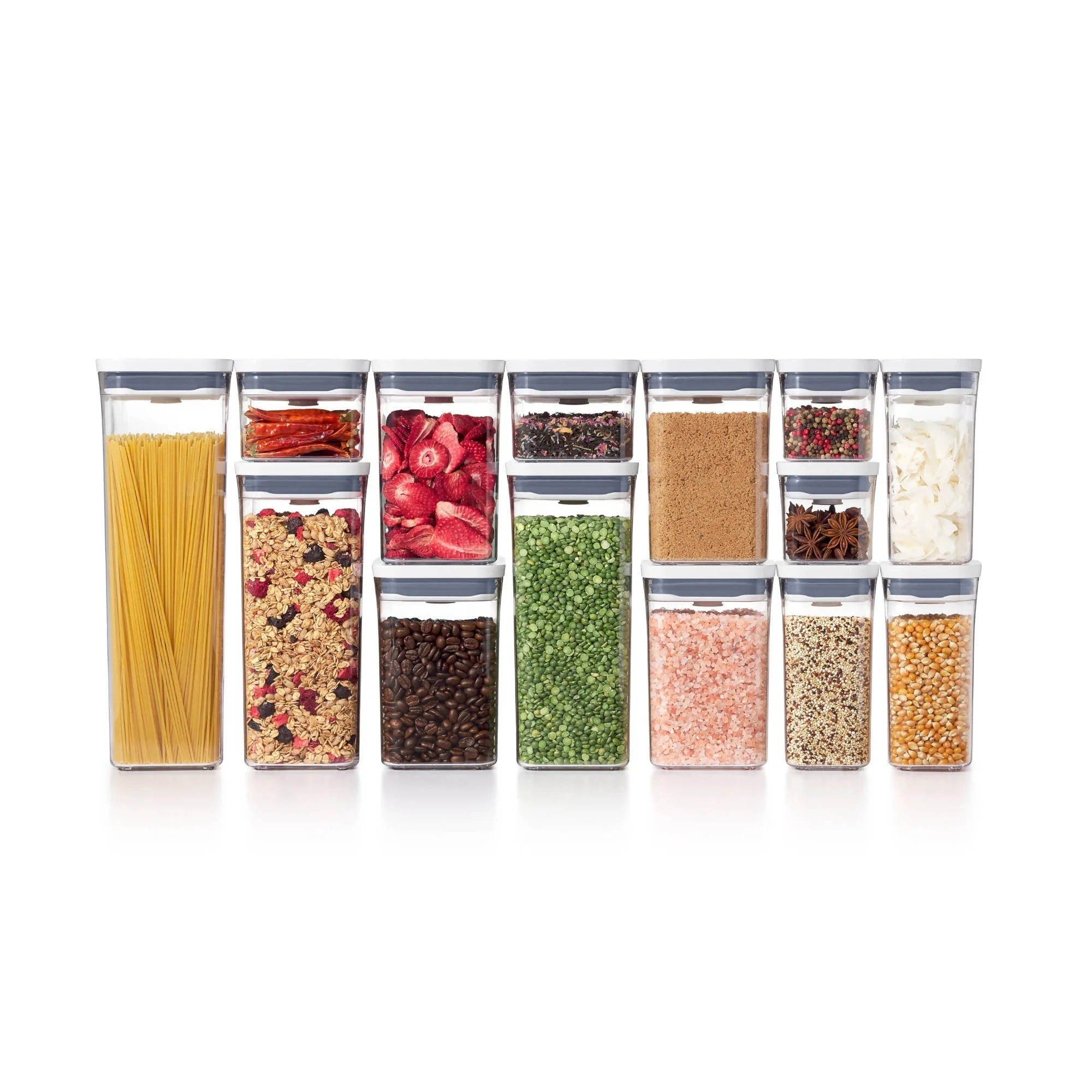 Organiza tu cocina de manera elegante y eficiente con el Set de 20 Contenedores Pop Premium de Oxo. Este conjunto incluye 20 contenedores con tapas y sellos de silicona que cierran herméticamente al presionar, asegurando que tus alimentos se mantengan crujientes y frescos por más tiempo. Cada contenedor cuenta con esquinas redondeadas para verter los alimentos suavemente y evitar derrames, ideal para guardar alimentos secos como legumbres, arroz, cereales, tallarines y frutos secos. Además, las tapas se desmontan completamente para una limpieza fácil y son aptas para lavavajillas. Diseñados para apilarse y optimizar el espacio en tu despensa, estos contenedores de Oxo son la solución perfecta para mantener tu cocina organizada y tus alimentos frescos. Adquiere tu Set de 20 Contenedores Pop Premium de Oxo hoy y transforma tu despensa en un espacio de almacenamiento eficiente y elegante, manteniendo tus alimentos en perfectas condiciones.