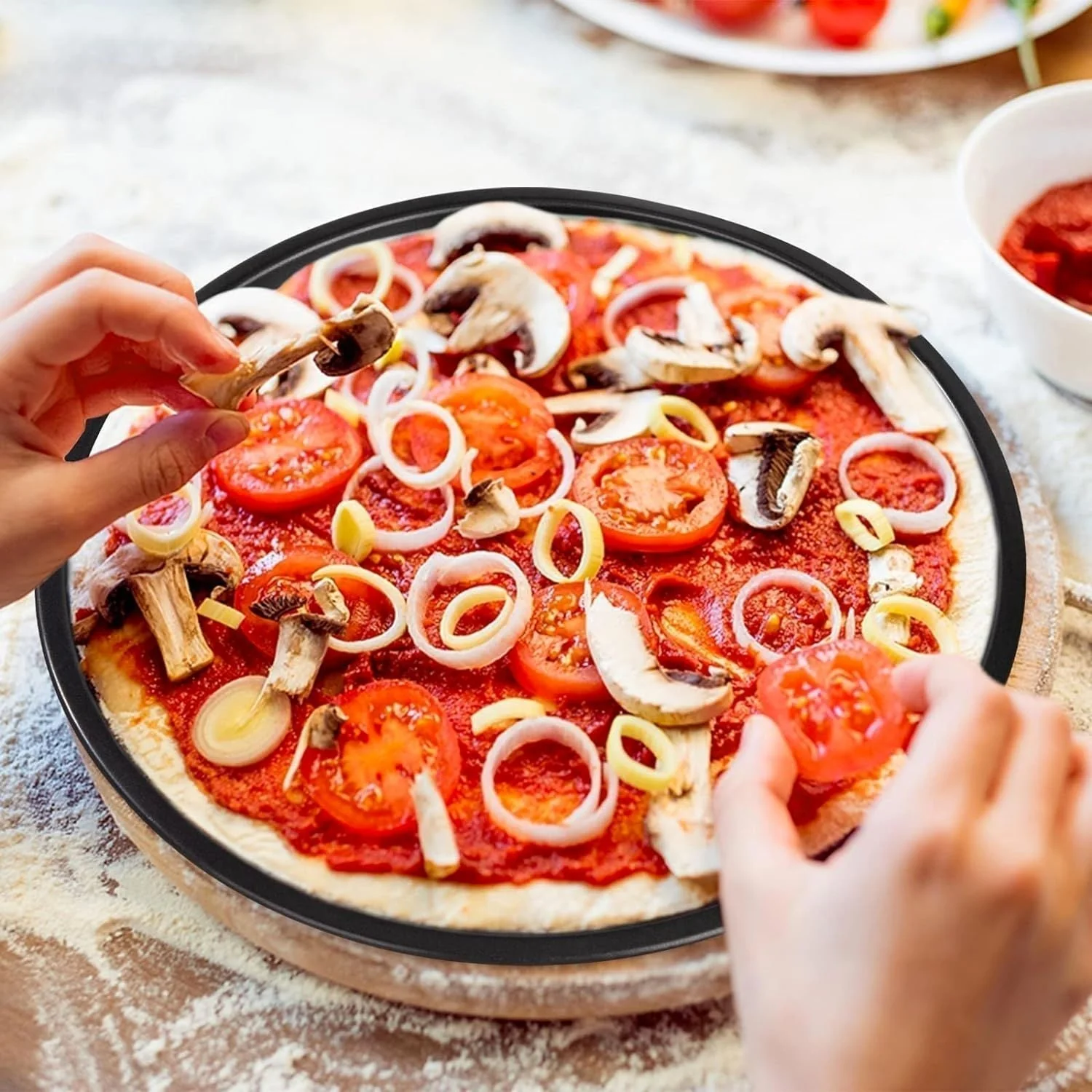 Eleva tu arte culinario con el Set 3 Bandejas De Horno Para Pizza de Santú Home & Deco, incluyendo tamaños de 35, 29, y 24 cm, perfecto para cualquier ocasión. Diseñado para los amantes de la pizza, este set transforma tu cocina en una pizzería profesional. Cada bandeja cuenta con un borde de relieve para manipulación sencilla y un revestimiento antiadherente para liberación fácil y limpieza rápida. Fabricado en acero de alta calidad, es duradero, resistente y seguro para contacto con alimentos. Ideal para pizzas, pasteles, quiches y más. Con este set, cada preparación culinaria es una oportunidad para innovar. Adquiere el tuyo y convierte cada comida en una experiencia inolvidable.