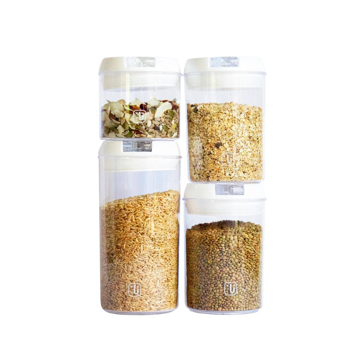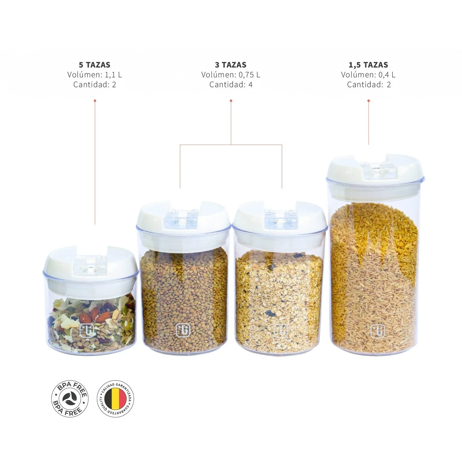 Optimiza tu almacenamiento de alimentos con el Set de 4 Contenedores Herméticos de Simplit. Estos contenedores, fabricados en plástico resistente y libre de BPA, son esenciales para mantener tus alimentos frescos y seguros gracias a sus tapas herméticas. El diseño apilable maximiza el espacio en tu cocina, ideal para organizar desde legumbres y granos hasta frutos secos. El set incluye cuatro tamaños: un contenedor de 400 ml para porciones pequeñas, dos de 750 ml para orden en la despensa, y uno de 1100 ml para cantidades mayores. Adquiere este práctico set de Simplit y disfruta de una cocina más organizada y alimentos que duran más.