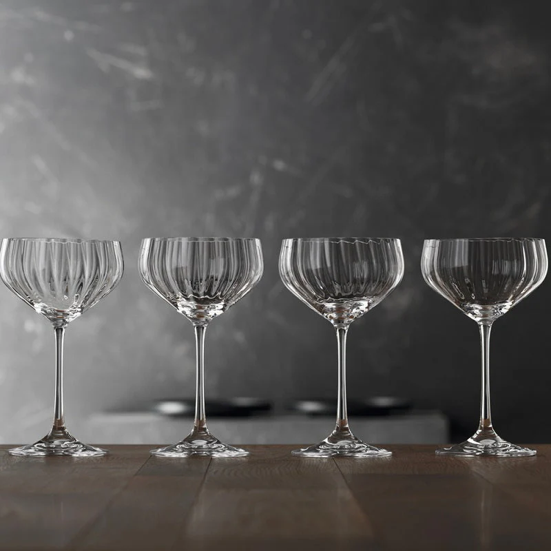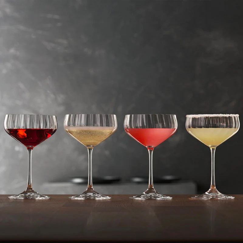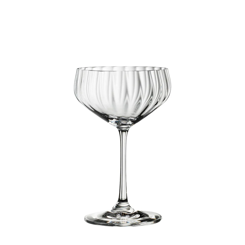 Como resultado, esta copa tiene una capacidad ligeramente mayor que la copa de cocktail. La palabra Coupette proviene del francés «coupe», que significa cuenco o copa. El hielo en bloques normalmente no se usa en esta copa, aunque es popular para bebidas congeladas dónde los ingredientes se mezclan en una licuadora con hielo y se sirven como una masa similar a un sorbete. Las copa Spiegelau LifeStyle están en casa donde se une el estilo de vida y la moda. Su moderna forma de diamante se destaca por la decoración lineal. Con su brillo y sus emocionantes efectos ópticos, estas copas de cristal contribuyen a crear un ambiente de alta calidad en cualquier mesa.