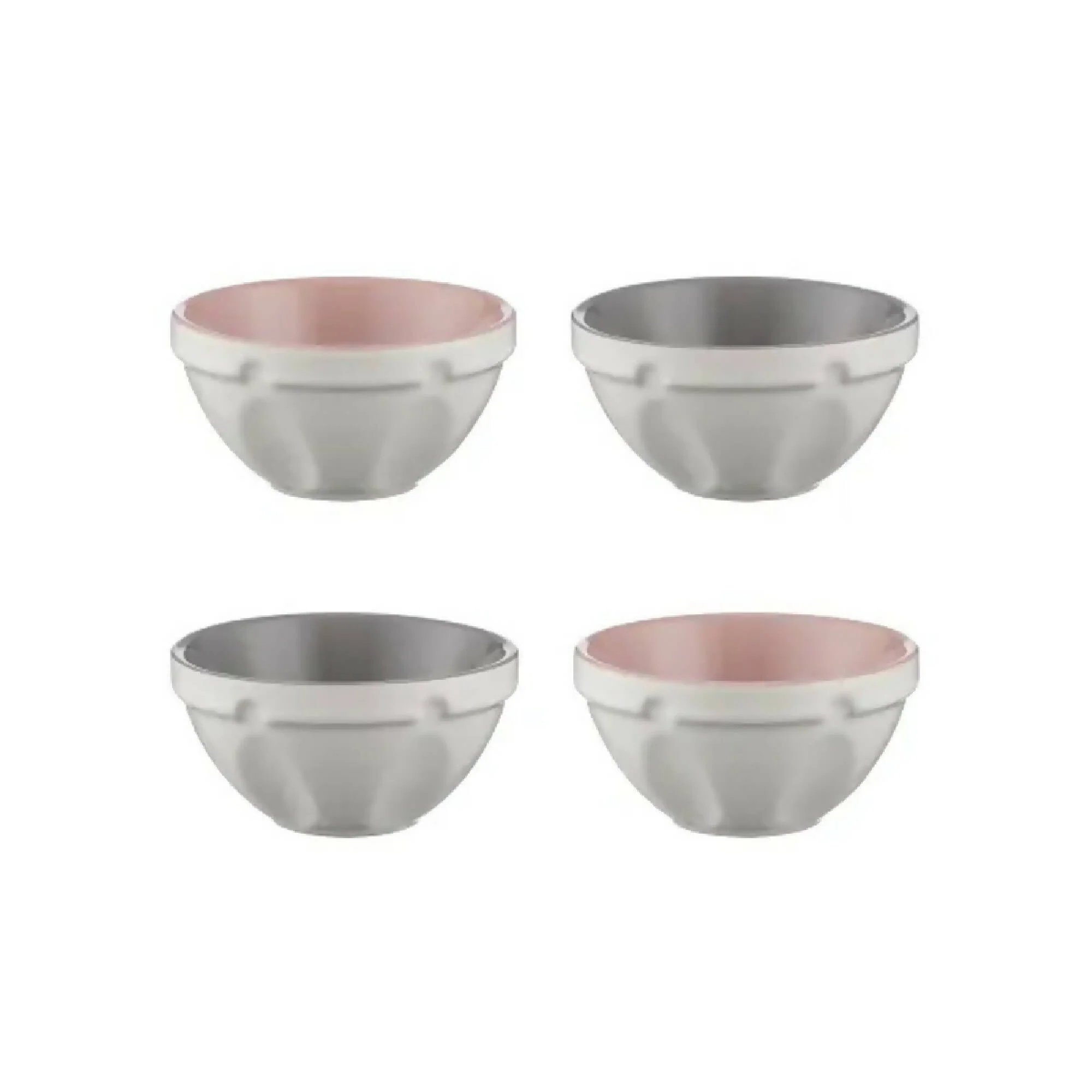 Sirve el postre o reúne todos tus ingredientes para hornear con el innovador juego de cocina Mason Cash de 4 mini bowls de preparación de alimentos. Diseñados inteligentemente para que pueda aprovecharlos al máximo, estos bowls tienen un exterior único que les permite inclinarlos. El exterior texturizado también te ayuda a mantener un buen agarre, incluso con las manos mojadas. Están hechos de cerámica de alta calidad resistente a las astillas, son aptos para microondas, horno, freezer y lavavajillas. Entonces, ya sea que necesite derretir chocolate o mantener sus postres congelados, estos bowls de preparación son perfectos!. El set incluye 4 bowls, 2 con interior rosado y 2 con interior gris.