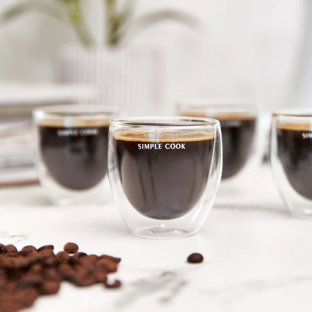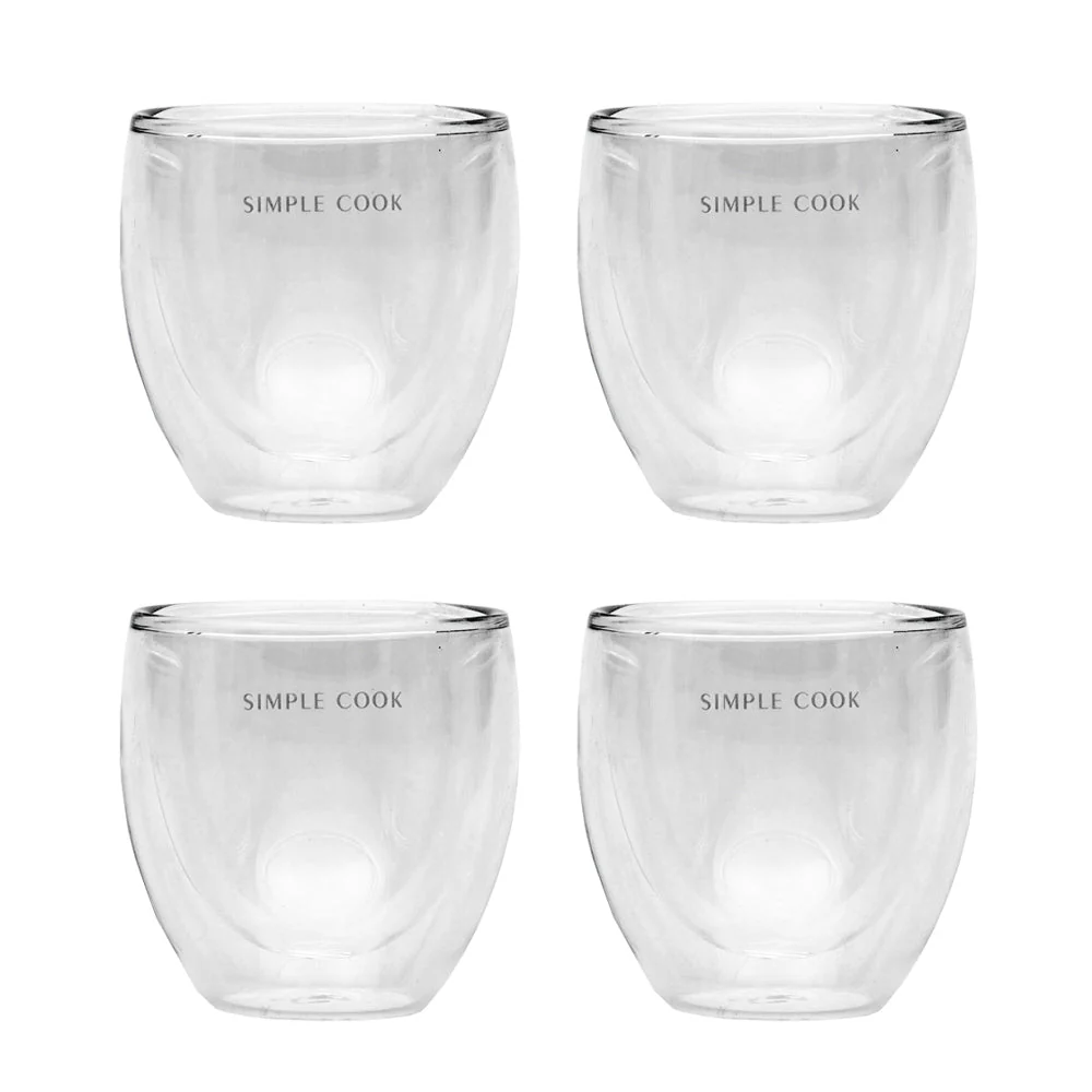 El Set de 4 Tazas Espresso Simple Cook, ideal para amantes del café, hecho de vidrio borosilicato de doble pared que mantiene la temperatura óptima, caliente o fría. Cada taza de 80 ml es perfecta para espressos intensos. Su diseño elegante ofrece aislamiento térmico, protegiendo tus manos y preservando el aroma y sabor únicos del café. Estas tazas son esenciales para cualquier ocasión, añadiendo un toque de sofisticación a tu experiencia de degustación. Disfruta de un espresso auténtico con estilo y confort.