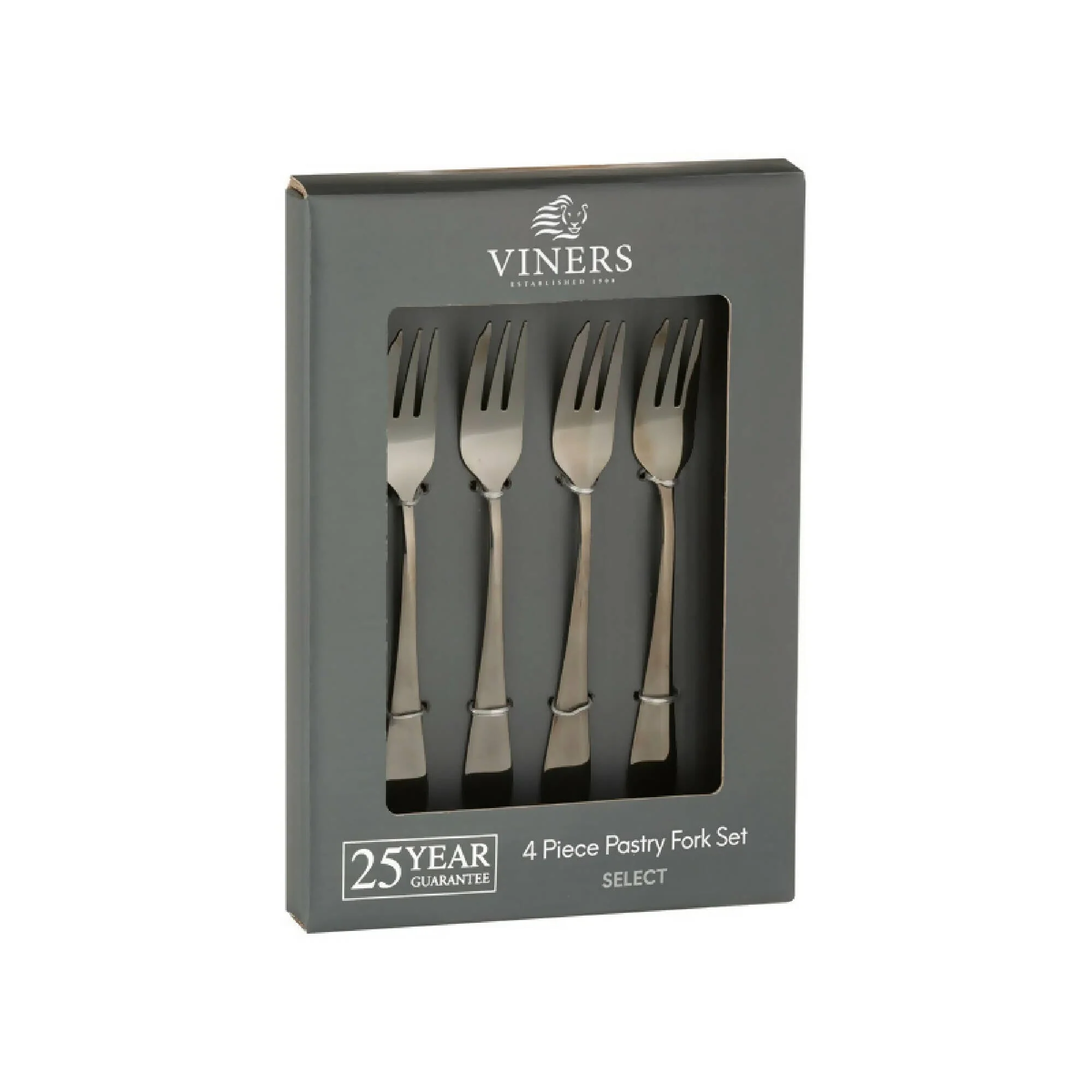 El juego de tenedores Viners Select de 4 piezas es perfecto para disfrutar de pasteles, tartas y postres pequeños. Los cubiertos están hechos de acero inoxidable 18.0 de la mejor calidad, con un recubrimiento de titanio adicional para mayor resistencia y durabilidad. La línea Select cuenta con una forma clásica de mango en forma de lágrima. Cada pieza está acabada con una linda capa gris, que agrega estilo a cualquier celebración o té de la tarde. Viene en una linda caja de regalo de papel de aluminio plateado y negro mate que agrega un toque de calidad y elegancia, lo que lo convierte en un regalo ideal. Viners existe desde hace más de 110 años y se ha convertido en una marca británica muy querida y un nombre familiar, impregnado de herencia.