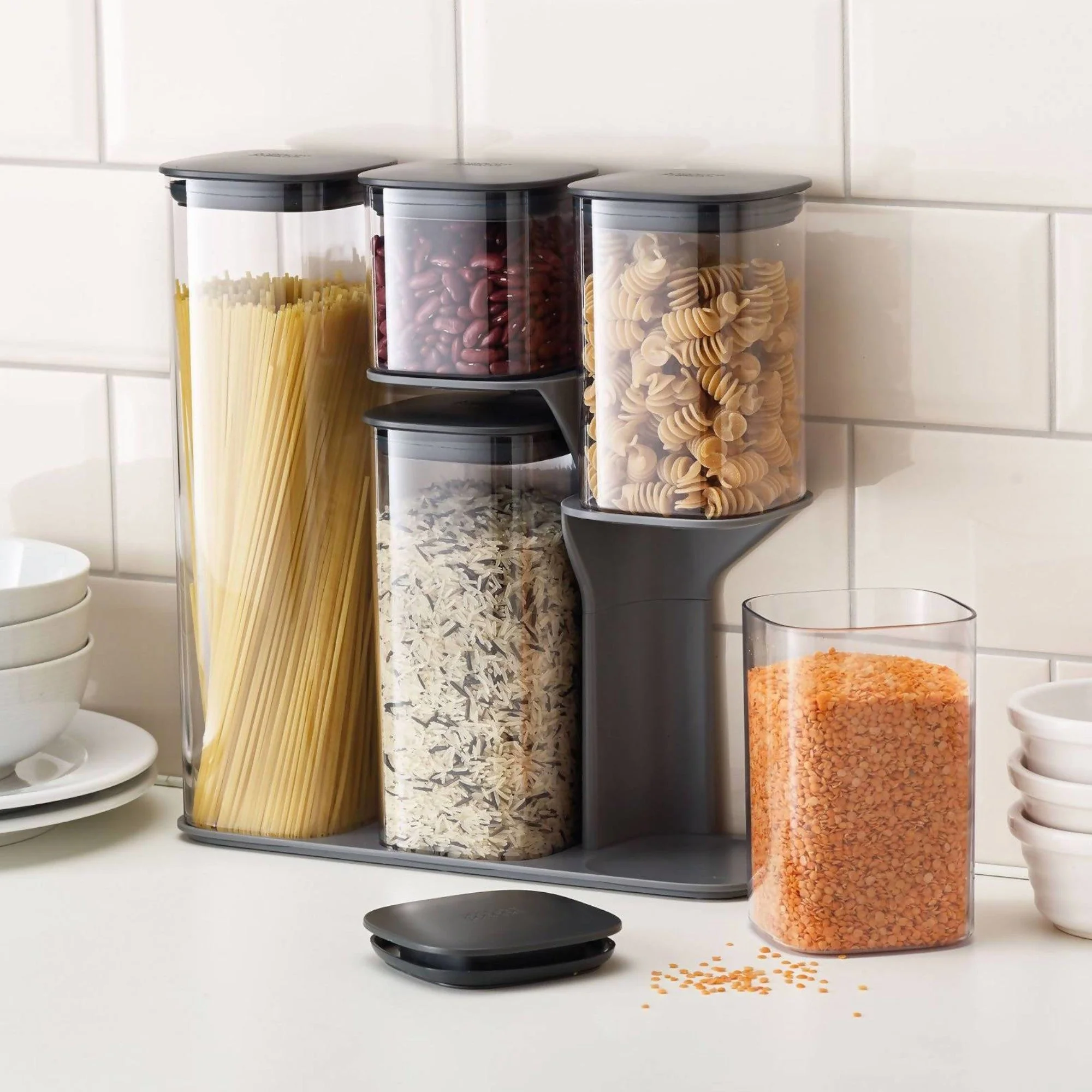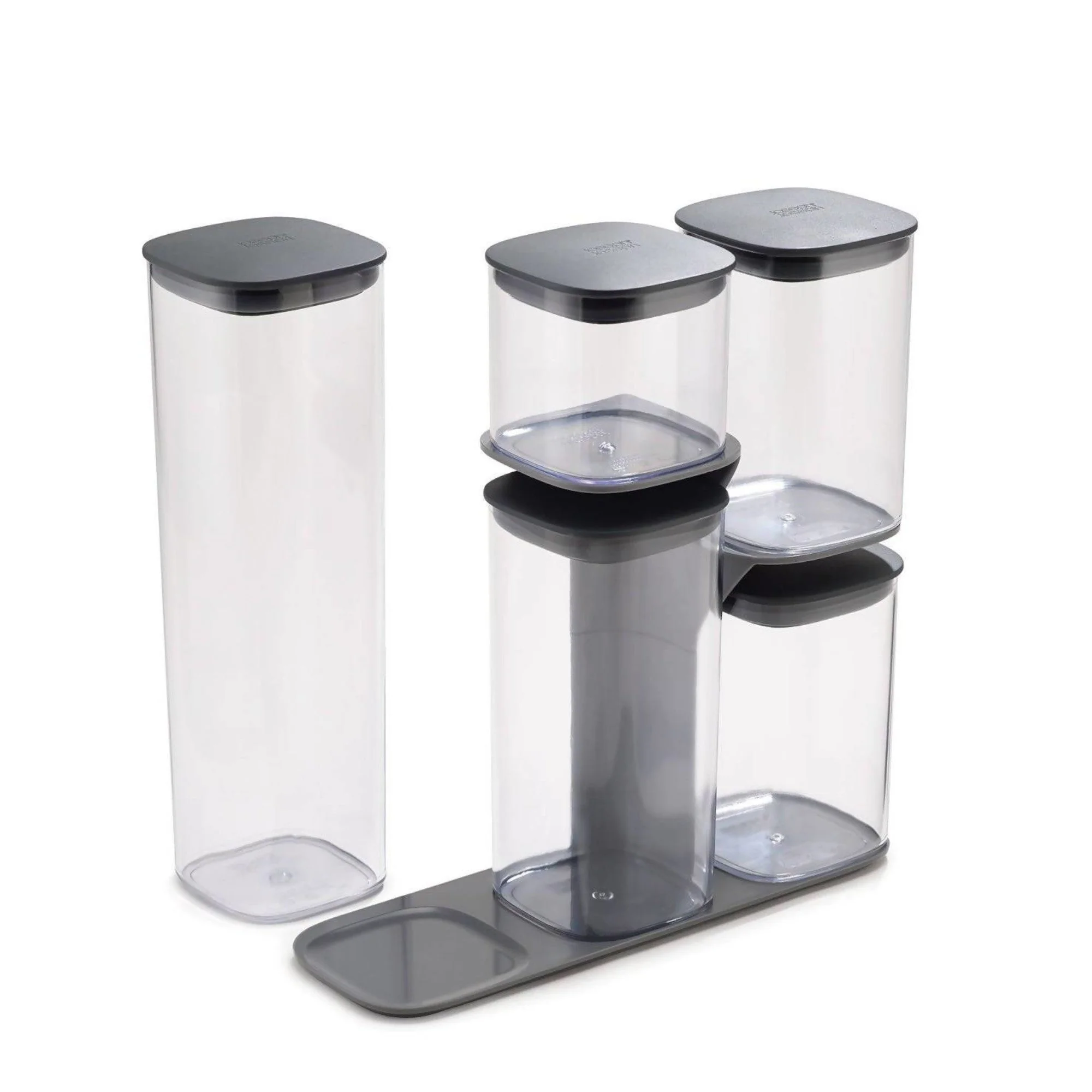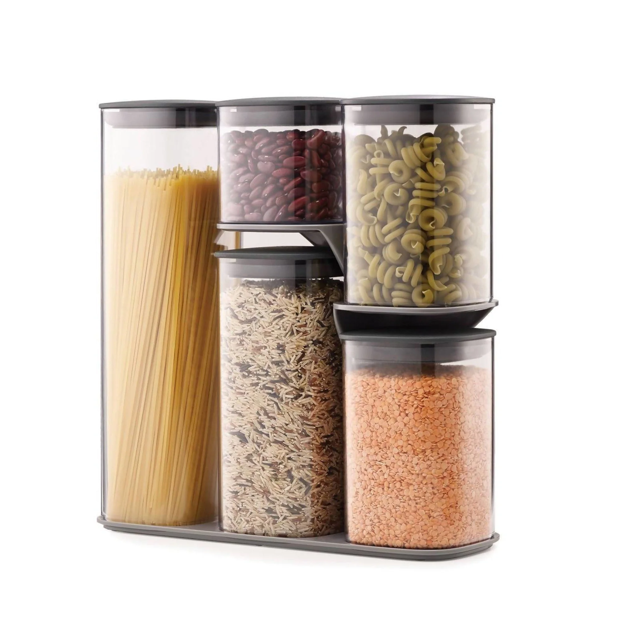 Incluye una base inteligente que soporta cada contenedor de forma individual, por lo que no necesitas sacar los otros contenedores apilados para llegar al que necesitas. El set incluye 5 contenedores de diferentes tamaños con tapas con sellos de silicona herméticos que mantendrán tus alimentos frescos y crujientes por más tiempo. Además, los contenedores tienen esquinas redondeadas para verter fácilmente tus ingredientes sin derramar. Es perfecto para mantener tus ingredientes secos a la vista sobre el mesón y poder acceder a ellos fácilmente.