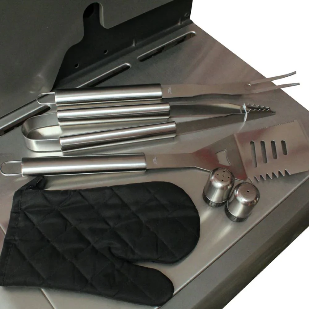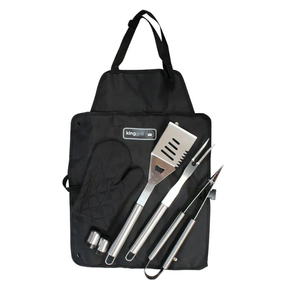 El Set de Accesorios para Asados Kinggrill es la solución definitiva para cualquier parrillero apasionado. Este completo set incluye un delantal que se convierte en un práctico bolso, facilitando el transporte y almacenamiento de todos tus utensilios. Equipado con un delantal, salero, pimentero, espátula, pinzas, tenedor y un guante resistente al calor, tendrás todo lo necesario para manejar tus cortes con precisión y seguridad. Diseñado para maximizar la comodidad y eficiencia durante tus asados, este set combina funcionalidad y estilo, convirtiéndose en el compañero ideal para cualquier parrilla. ¡Lleva tus asados al siguiente nivel con Kinggrill !
