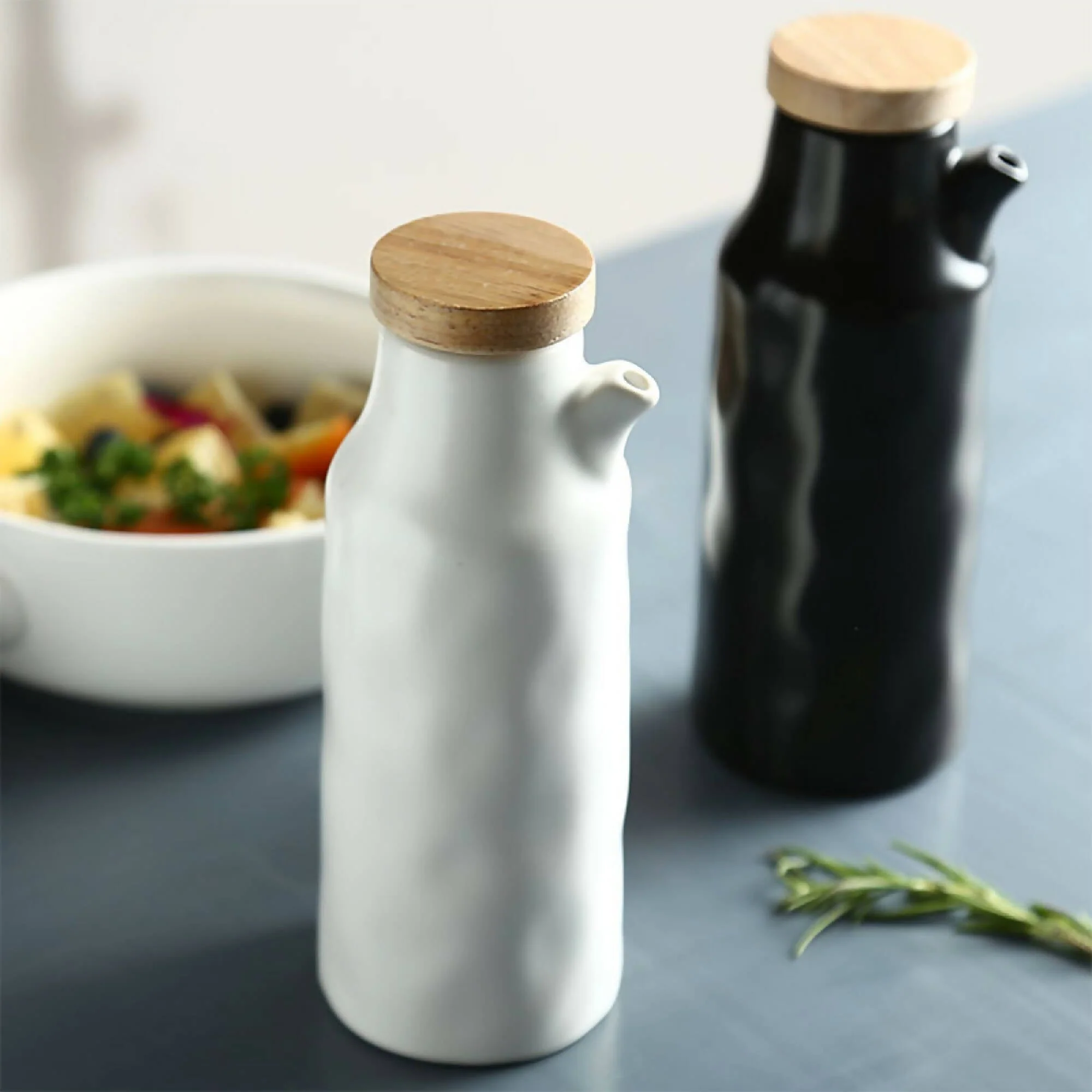 Moderno Set Alcuza Cerámica 2 Piezas Redonda 500 ml Simplit con tapa de madera. Diseño simple y minimalista para acompañar con aceite, aceto, limón, tus comidas. No existen las fugas gracias a su tapa con un sello de silicona anti deslizante.