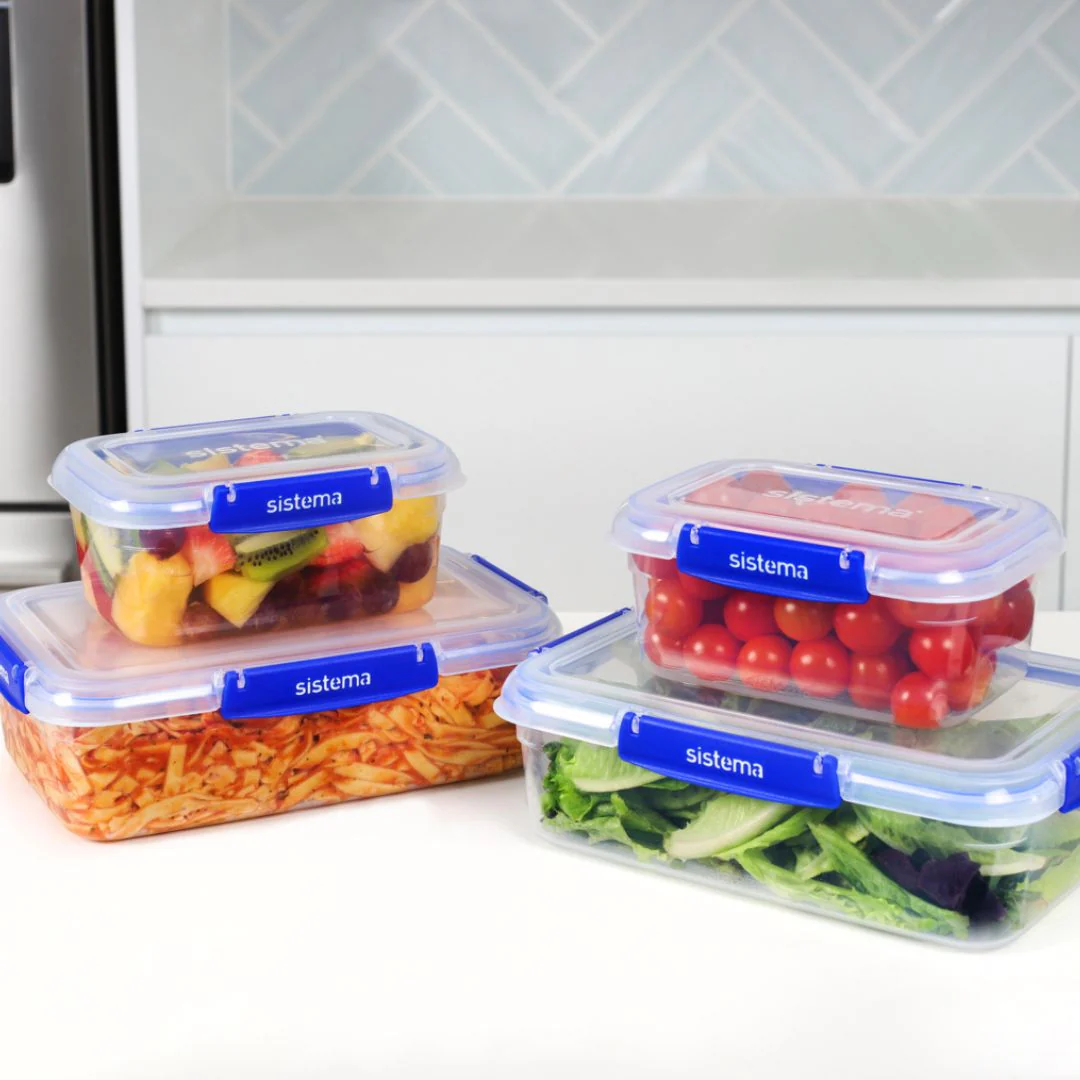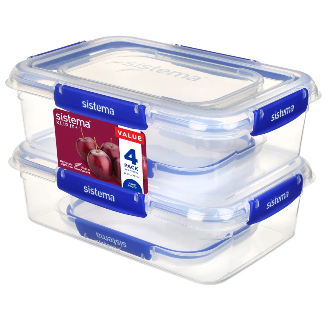 Diseñado con un sello a prueba de fugas incorporado, perfecto para mantener la comida fresca. Simplemente llene el recipiente y cierre los distintivos clips de cierre fácil de Sistema®. Seguro de usar en el lavavajillas (en la rejilla superior), el microondas (sin la tapa) o en el refrigerador y el congelador, hay un recipiente KLIP IT PLUS ™ para todas sus necesidades. El paquete contiene: 2 x 1L / 33.8 oz, 2 x 2.2L / 74.3 oz.
