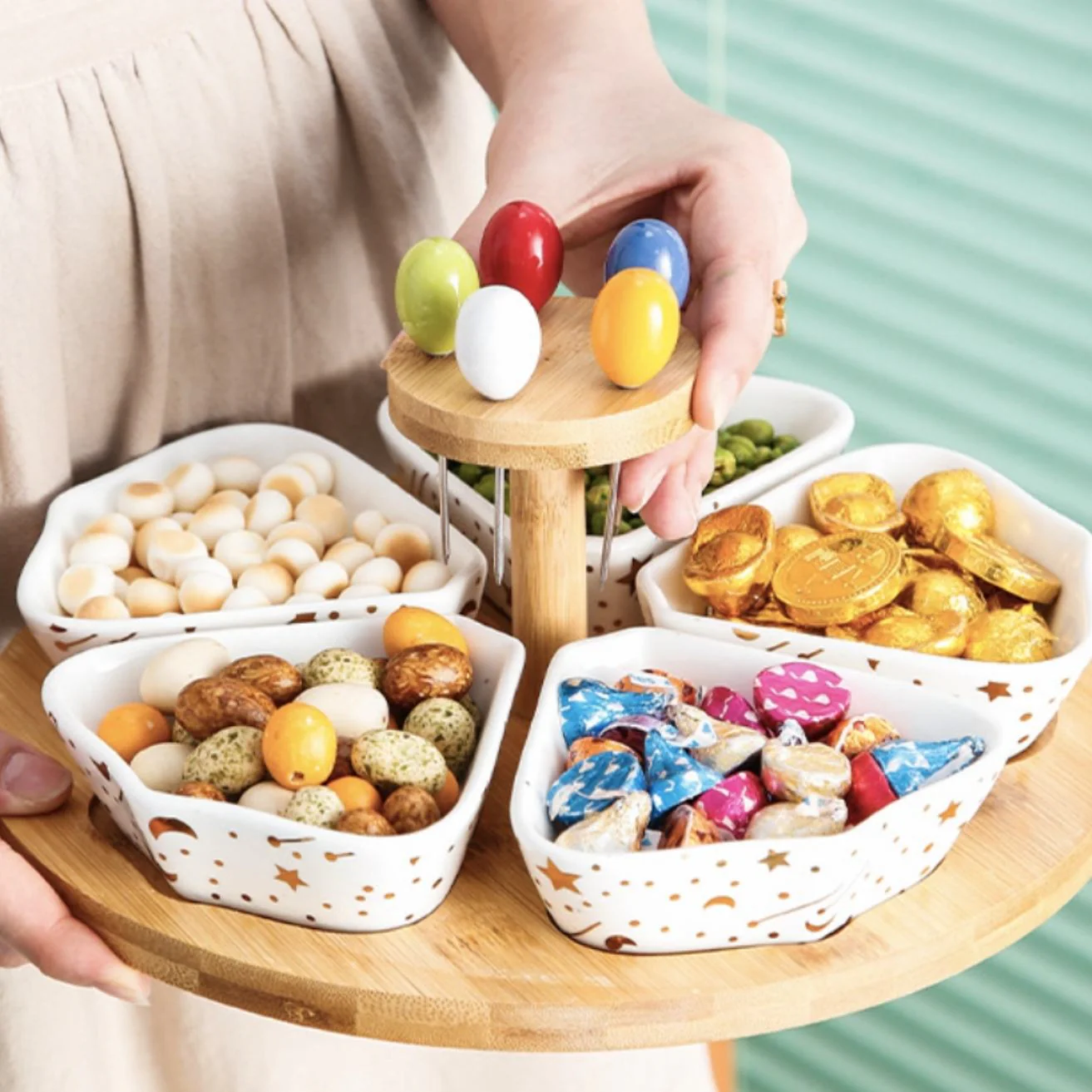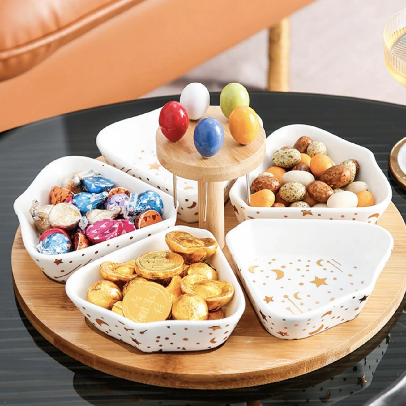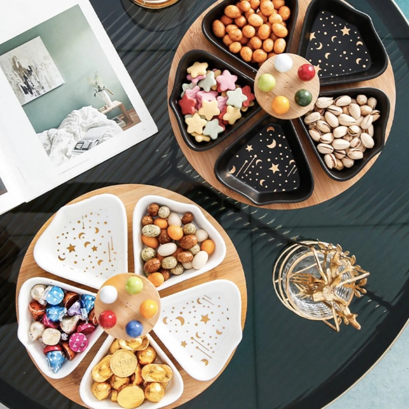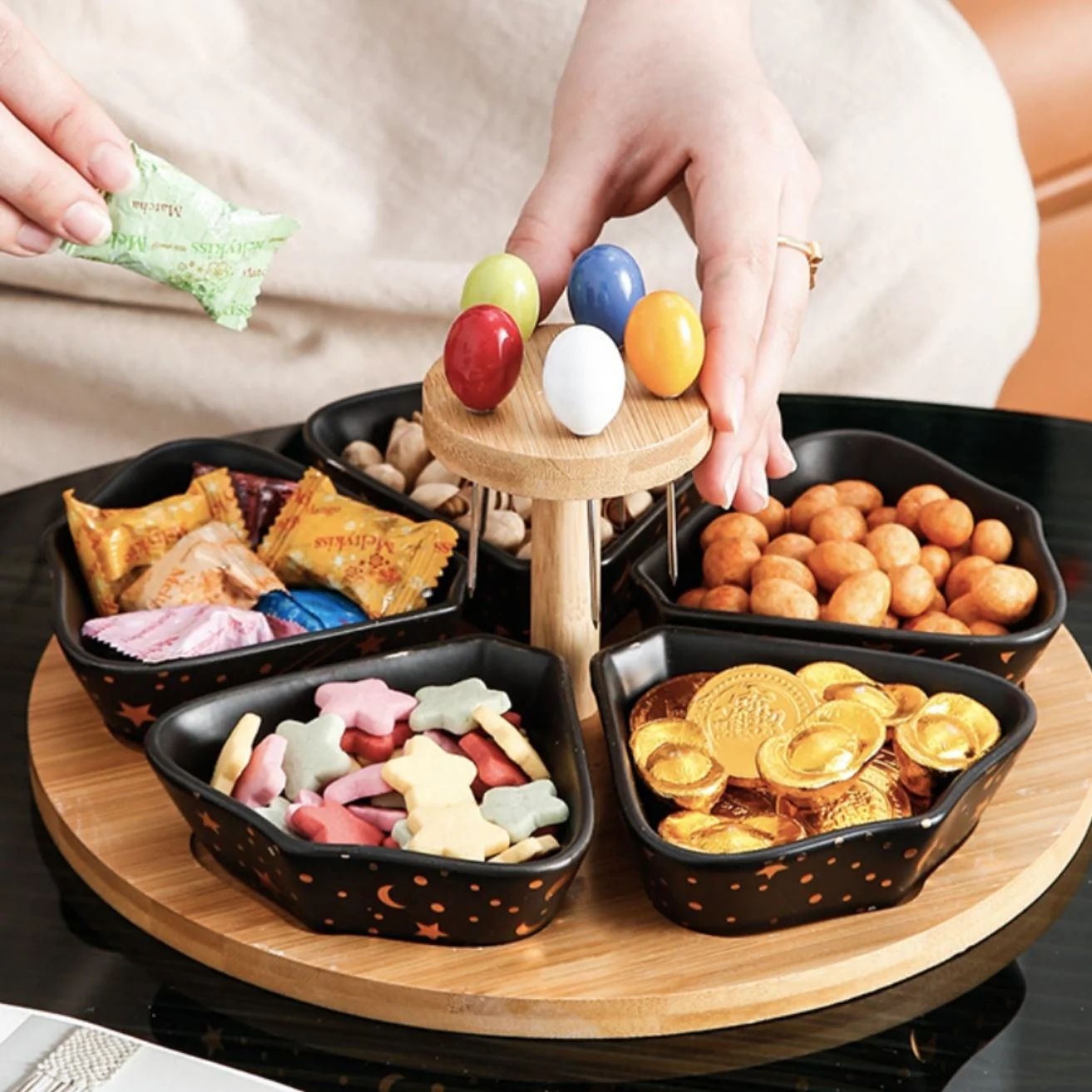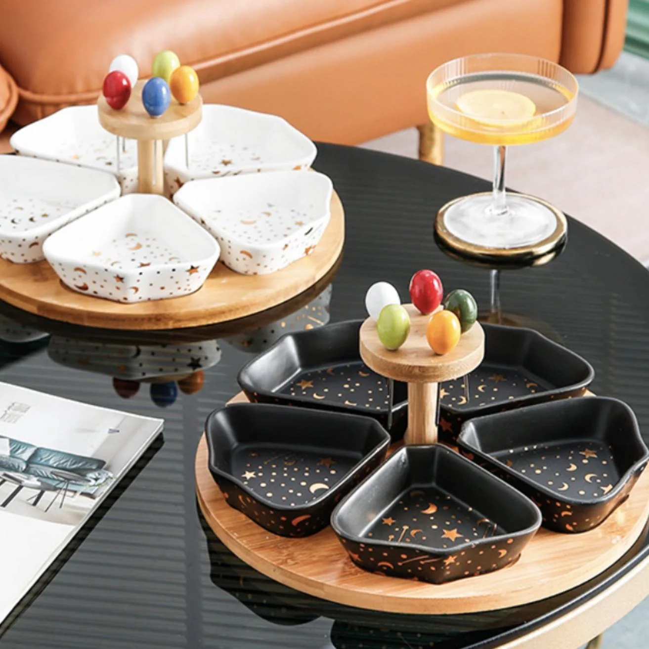 Destaca en tus reuniones con el Set de Bandeja para Aperitivos de Santú Home & Deco. Organiza tus aperitivos de forma elegante y práctica en esta bandeja, diseñada para impresionar a tus invitados. Con cinco pocillos para una variedad de opciones, este set eleva la presentación de tus platos, convirtiendo cada ocasión en un evento especial. Invita a tus amigos y familiares a disfrutar de una experiencia gastronómica única con este conjunto de calidad excepcional. ¡Sorprende a tus invitados y haz que tus reuniones sean inolvidables con el Set de Bandeja para Aperitivos de Santú Home & Deco!