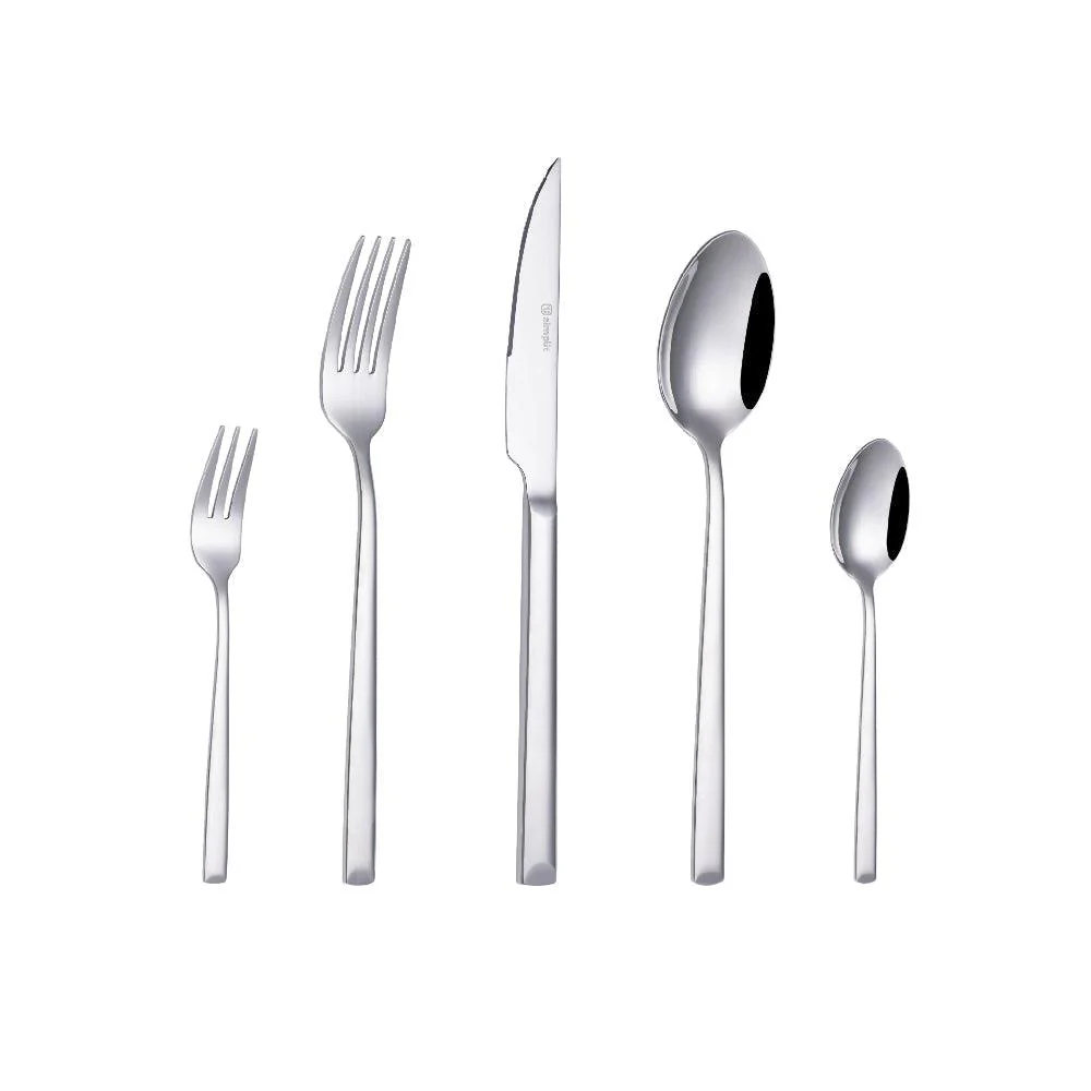 Incluye: – 5 Tenedores grandes (Largo: 20,6 cm, Peso: 43 g, Espesor: 3,0 mm). – 5 Tenedores pequeños (Largo: 14,5 cm, Peso:15 g, Espesor: 2,0 mm). – 5 Cuchillos de carne (Largo: 22,6 cm, Peso 85 g, Espesor: 7,0 mm). – 5 Cucharas grandes (Largo: 20,7 cm, Peso: 53 g, Espesor: 3,0 mm). – 5 Cucharas de té (Largo: 14,4 cm, Peso: 17 g, Espesor: 2,0 mm).