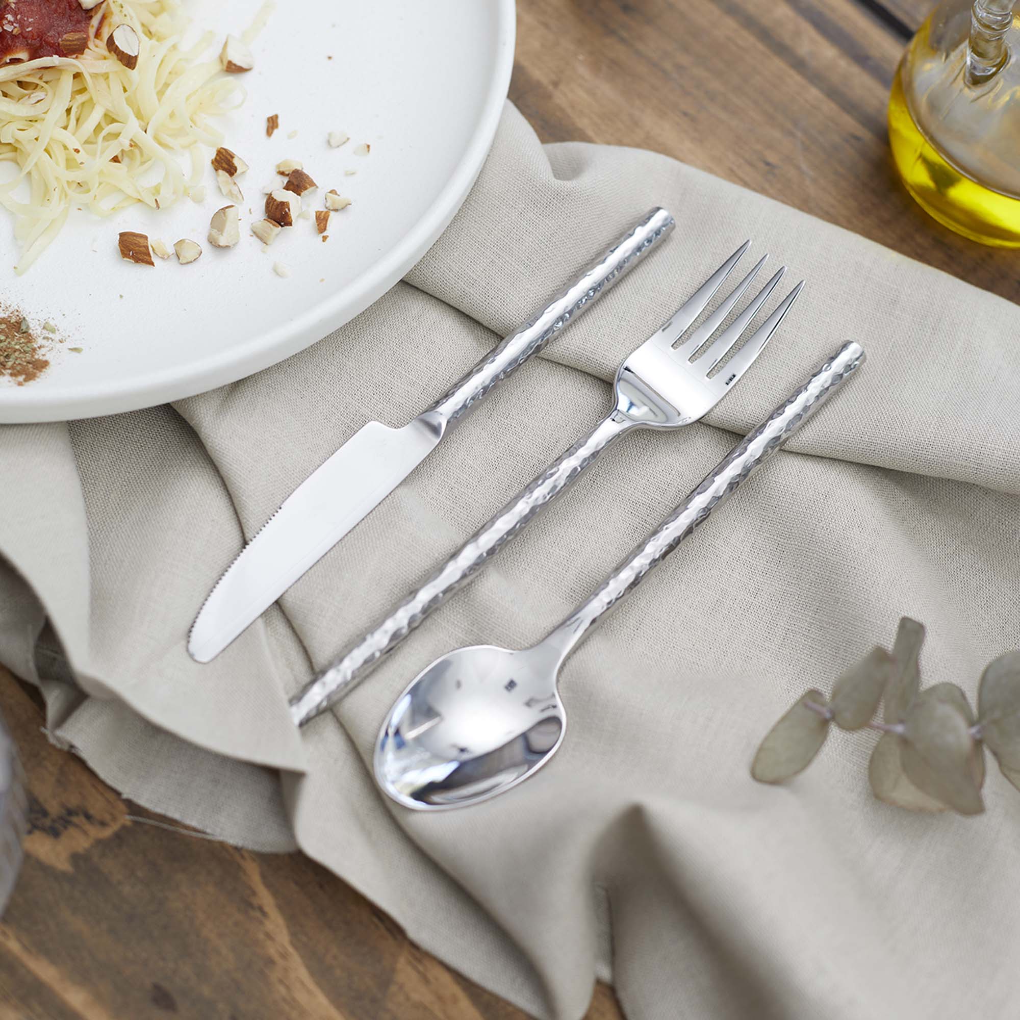 Descubre el set de cuchillería Hammered Coquinaria, diseñado para realzar cada momento en torno a la mesa. Este completo conjunto incluye tenedores, cuchillos y cucharas tanto para comida como para postre, además de cucharas de té, un detalle que marca la diferencia al ofrecer un set armonizado y completo en un solo modelo.