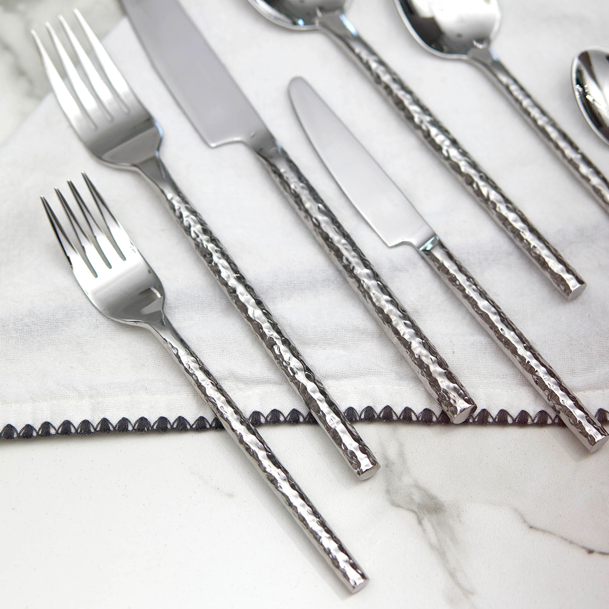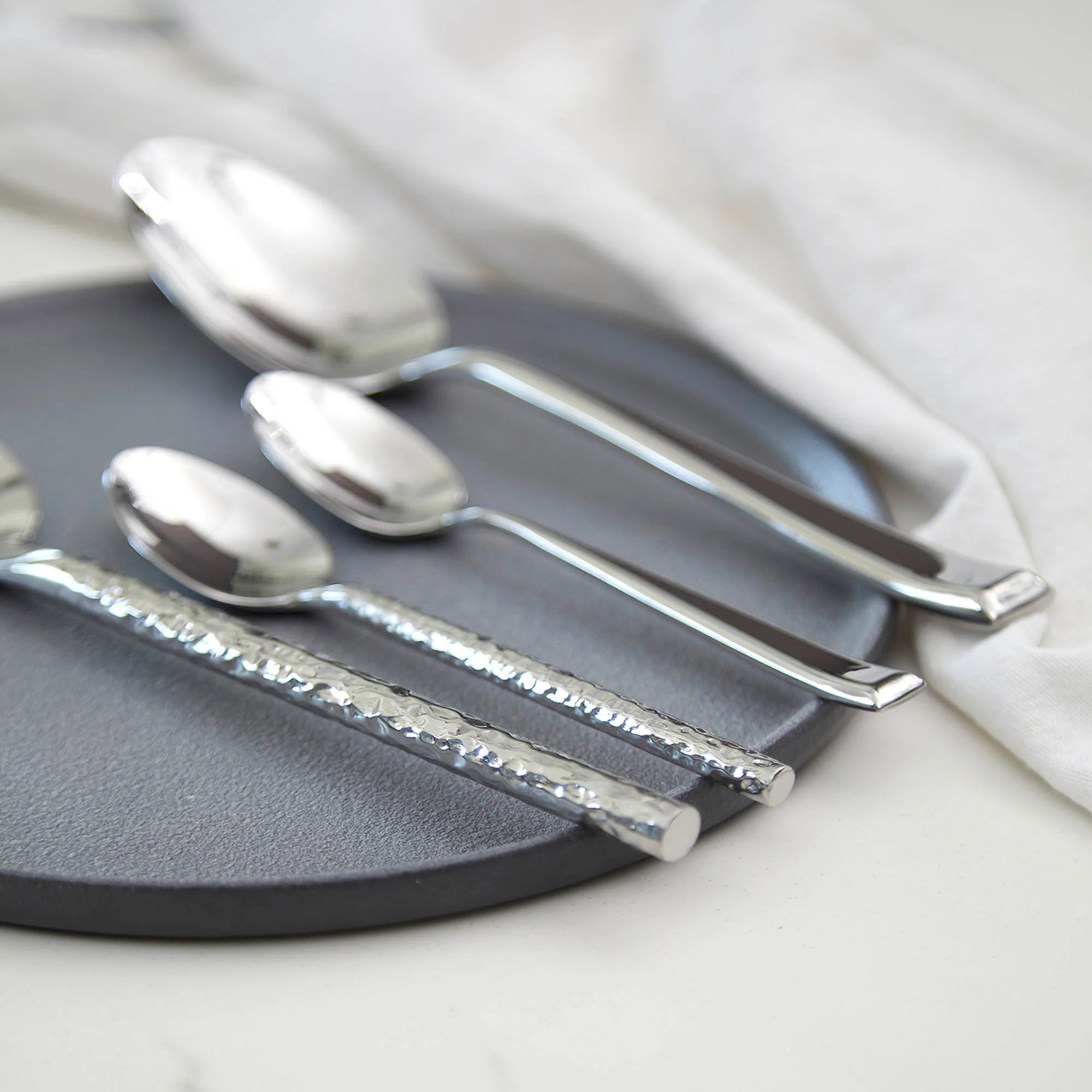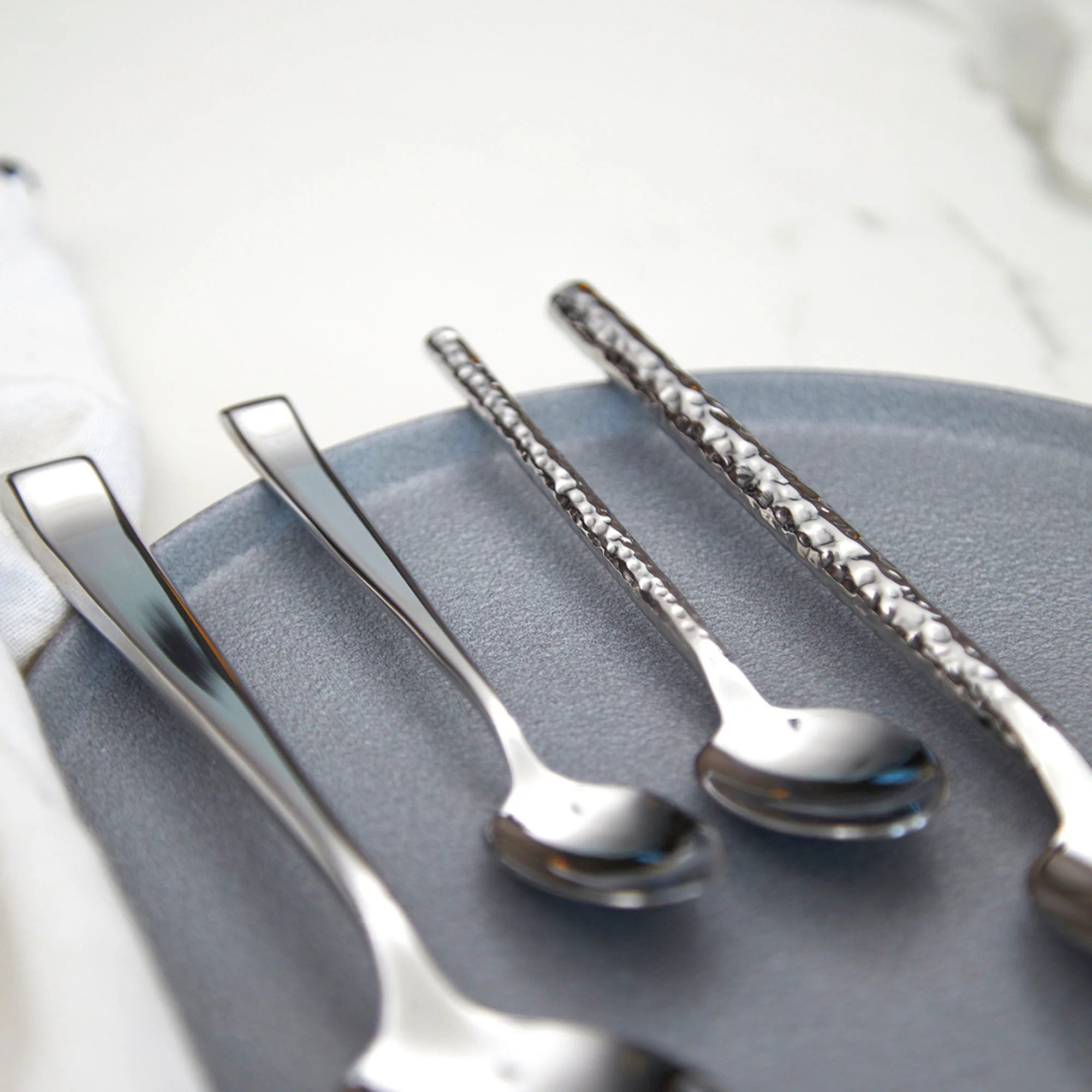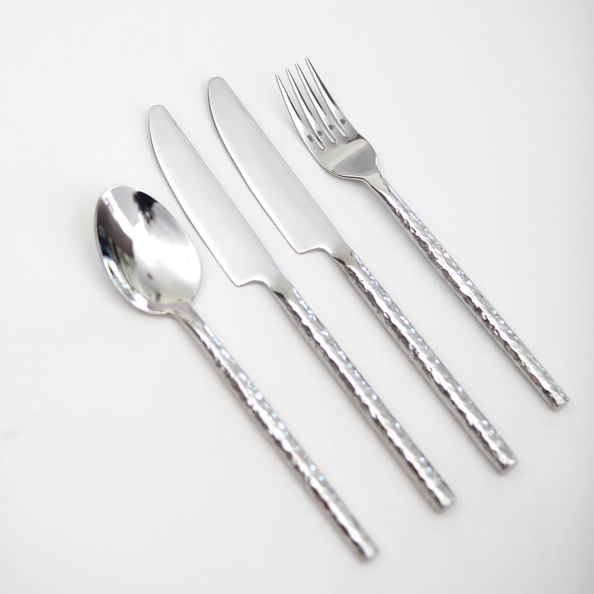 Fabricadas en acero inoxidable 304 con una terminación martillada brillante, estas piezas combinan modernidad y funcionalidad. Destacan por su resistencia a la corrosión, durabilidad y facilidad de limpieza, manteniendo su brillo impecable con el uso diario. Su diseño ergonómico y peso cuidadosamente balanceado ofrecen una experiencia gastronómica cómoda y sofisticada.
