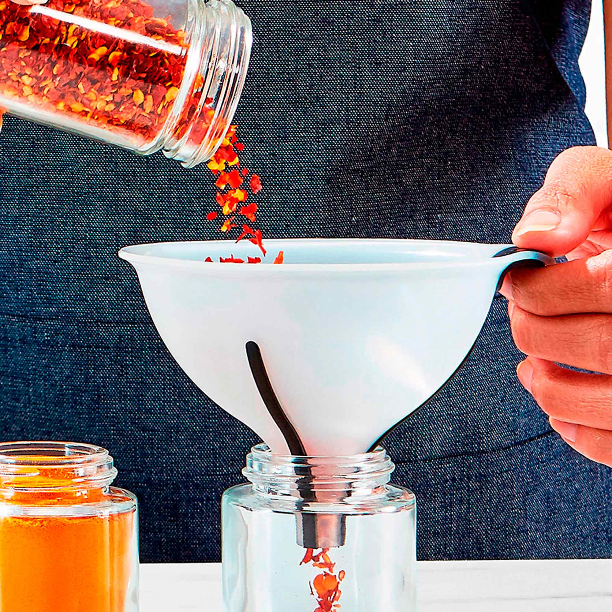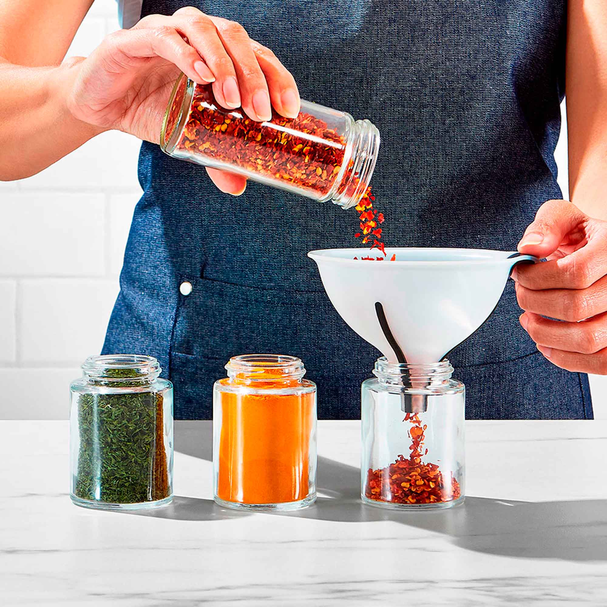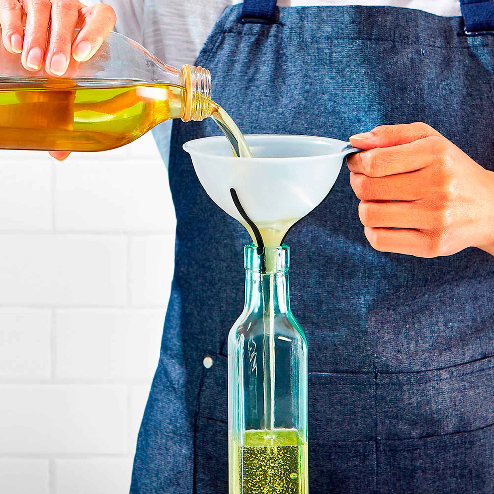 El Set de Embudos 3 Piezas Oxo es perfecto para llenar tu aceitera, guardar caldo o rellenar tus especieros. El set incluye 1 embudo pequeño de 120ml, 1 embudo grande de 475ml y 1 colador. El colador se introduce en los embudos para cuando necesitas colar el contenido antes de guardarlo, como por ejemplo caldo de pollo o verduras. Los embudos están hechos de silicona resistente al calor por lo que puedes transferir líquidos calientes. Además, tienen estrías antideslizantes en el cuello que mantienen el embudo en su lugar y permiten que salga el aire, evitando que el líquido salpique al verterlo. Las 3 piezas se guardan uno dentro de otra para ahorrar espacio y son aptas para lavavajillas. Capacidades: 120ml y 475ml