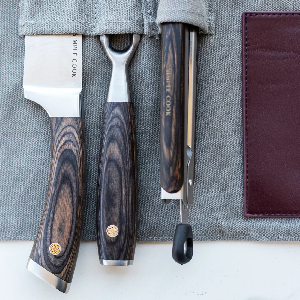 El Set Estuche Accesorios Parrillero Simple Cook incluye 4 accesorios parrilleros más un estuche ideal para transportar los utensilios y que lo convierten en un regalo único.