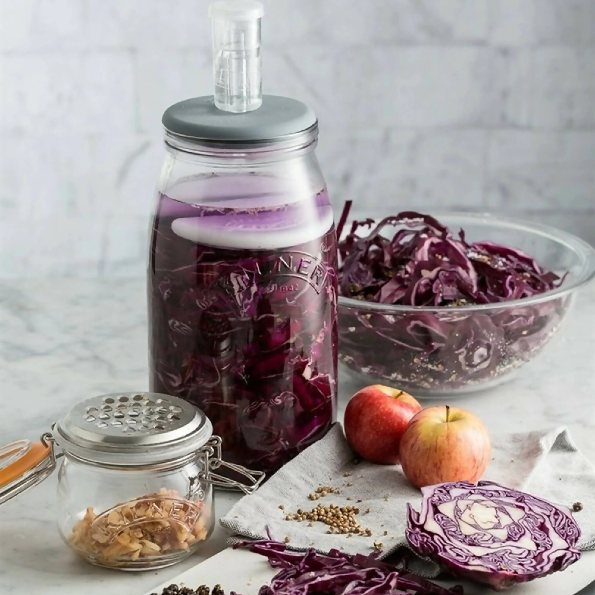 El set de fermentación Kilner proporciona la manera fácil de crear sus propios alimentos fermentados deliciosos llenos de vitaminas, minerales y cultivos probióticos. Perfecto para crear cultivos vivos de chucrut, kimchi, pickles y mucho más. Crear sus propios alimentos fermentados es sencillo, solo agregue sus verduras favoritas, agua y sal. IMPORTANTE: Cuando llene su frasco Kilner, asegúrese siempre de dejar un espacio libre máximo de 6,5 cm.El set incluye: 1 frasco de fermentación de 3 litros, 1 tapa de silicona, 1 bloqueo de aire, 2 piedras de cerámica y 1 recetario.