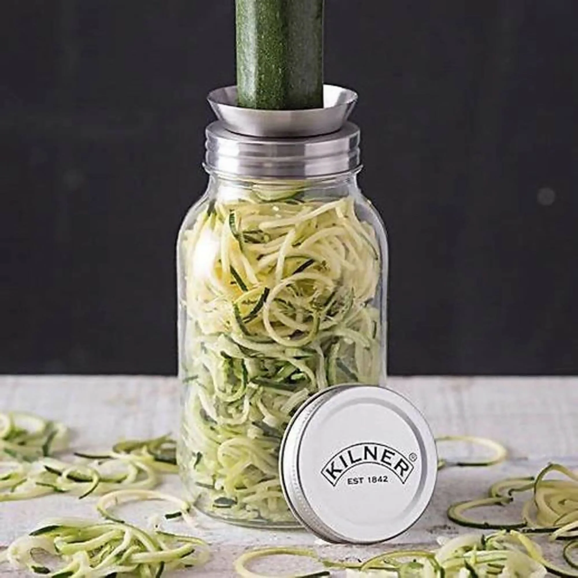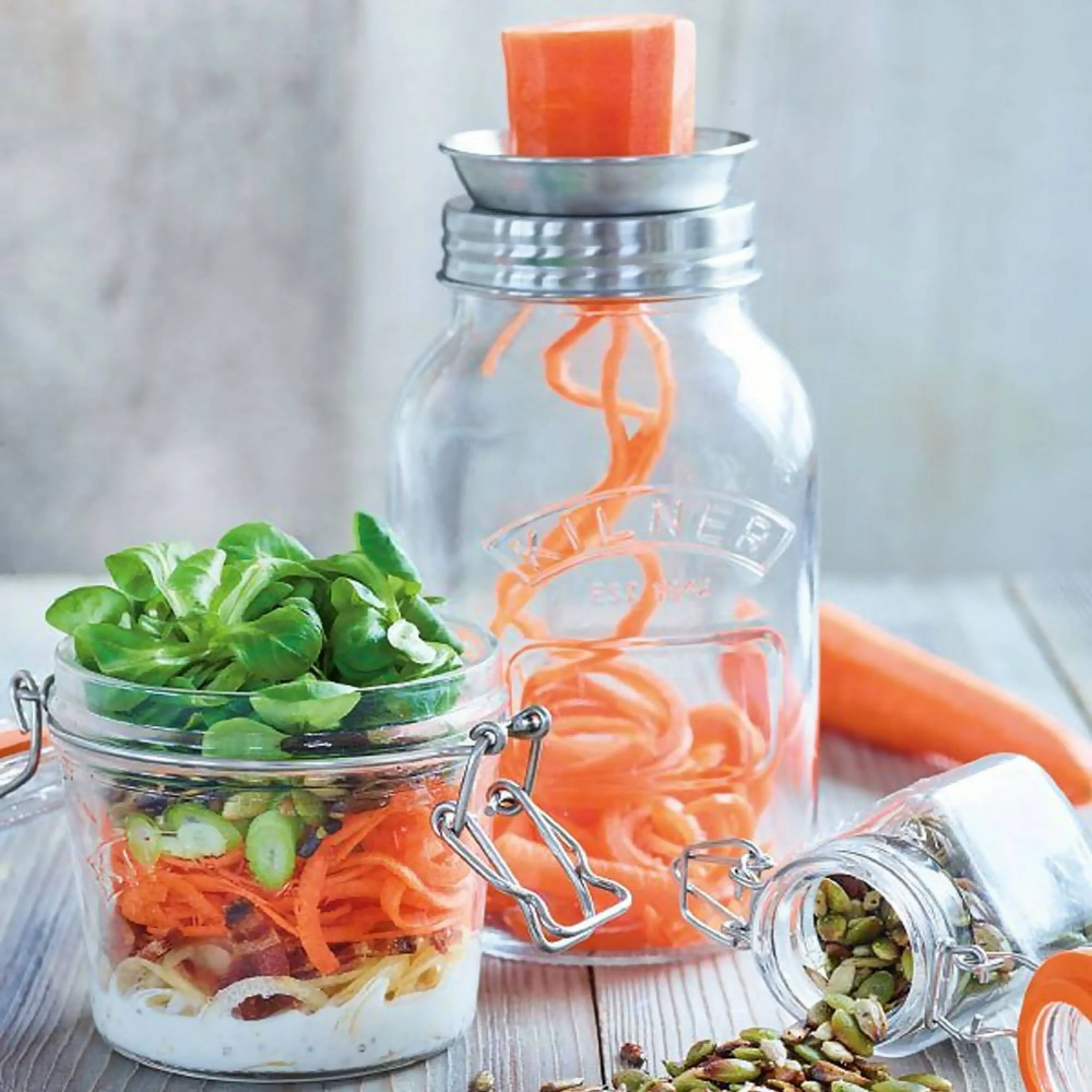 El tarro espiralizador vidrio Kilner es ideal para espiralizar verduras. Una forma muy práctica de introducir verduras en la dieta gracias al corte en espiral al estilo espaguettis y una alternativa más saludable al reducir el consumo de pasta y aumentar la verdura fresca. El tarro de 1 L de capacidad recoge directamente los espirales desde la cuchilla de corte. La tapa de repuesto permite sellar y guardar en el refrigerador o bien para llevar al trabajo. La banda de seguridad proporciona protección para los dedos mientras giras las verduras. El set incluye un tarro de un litro, un disco espirilizador y una bada de silicona