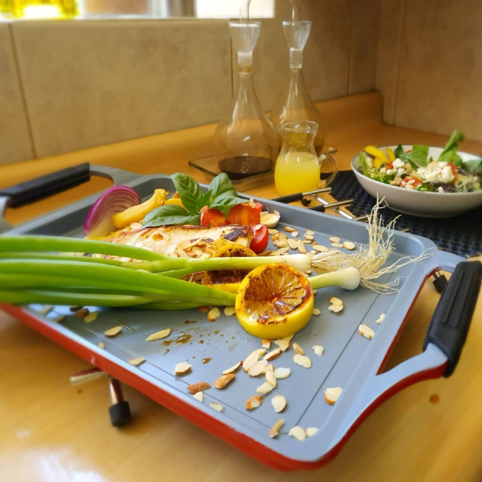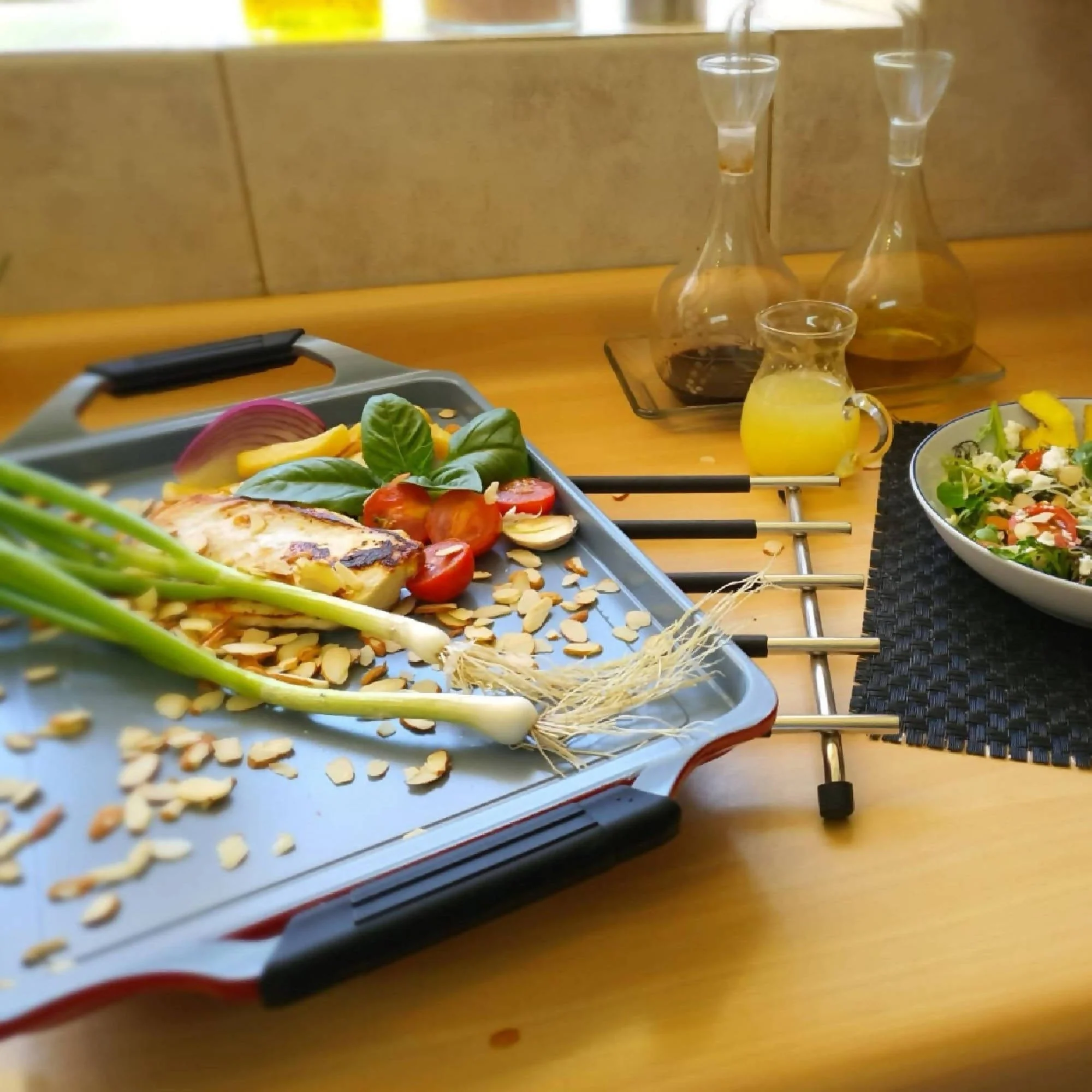 Protector de mesa en acero inoxidable ideal para llevar a su mesa para proteger su mesa o cualquier superficie que quiera aislar el calor, además trae una bandeja asadora 43x25cm de aluminio fundido para todo tipo de cocina incluida inducción, su antiadherente en cerámica nos permite cocinar mas saludable.