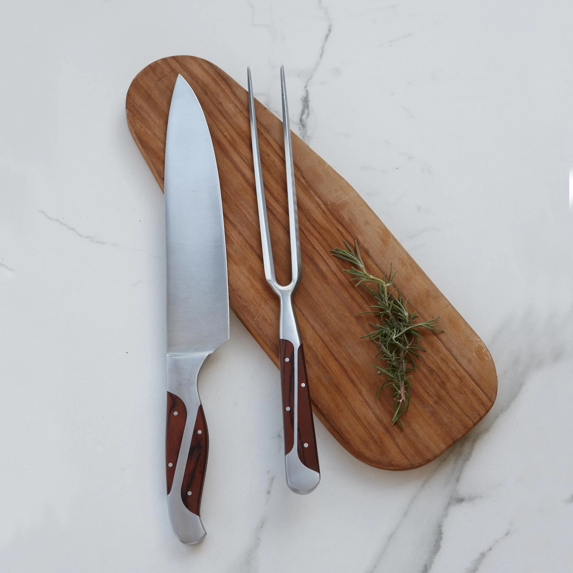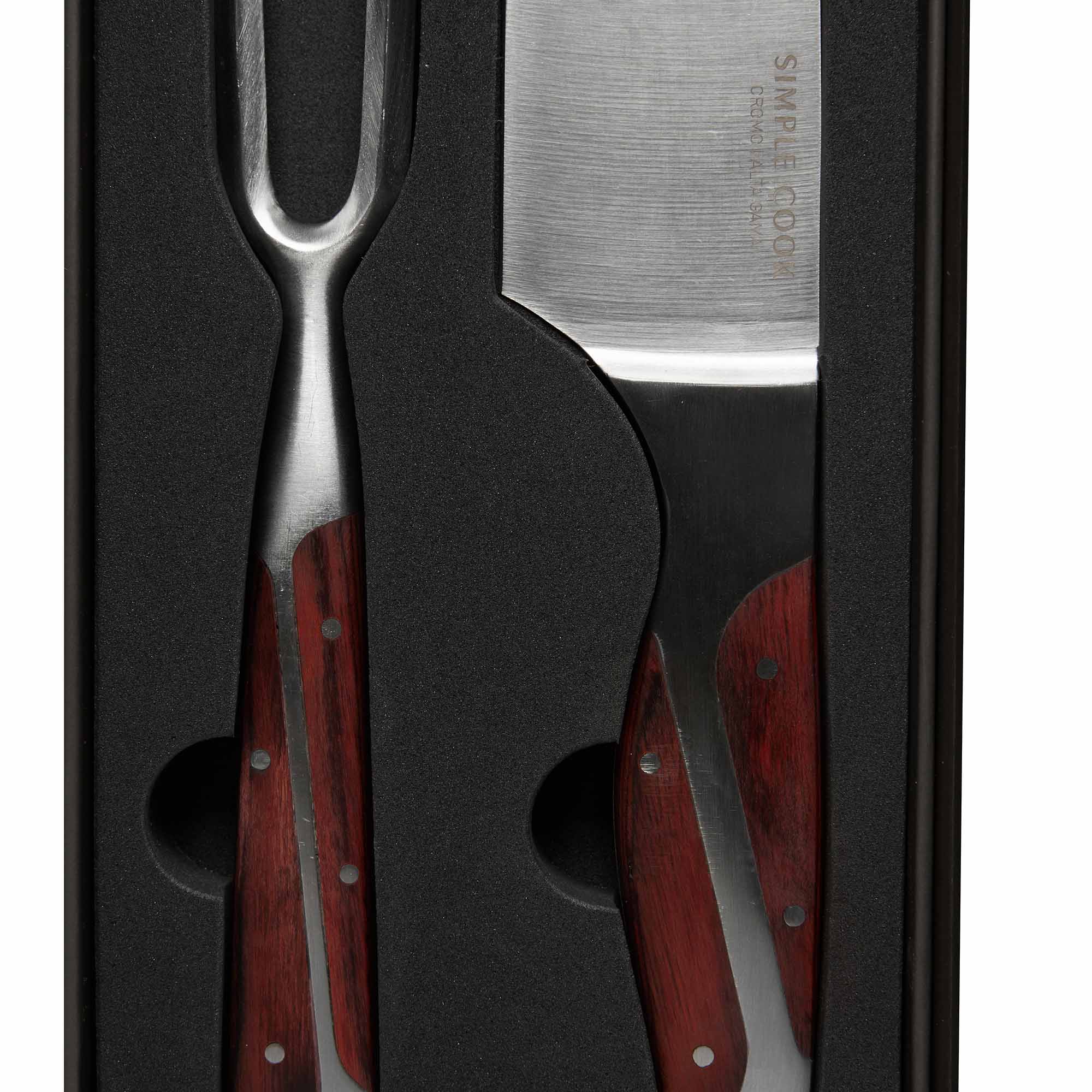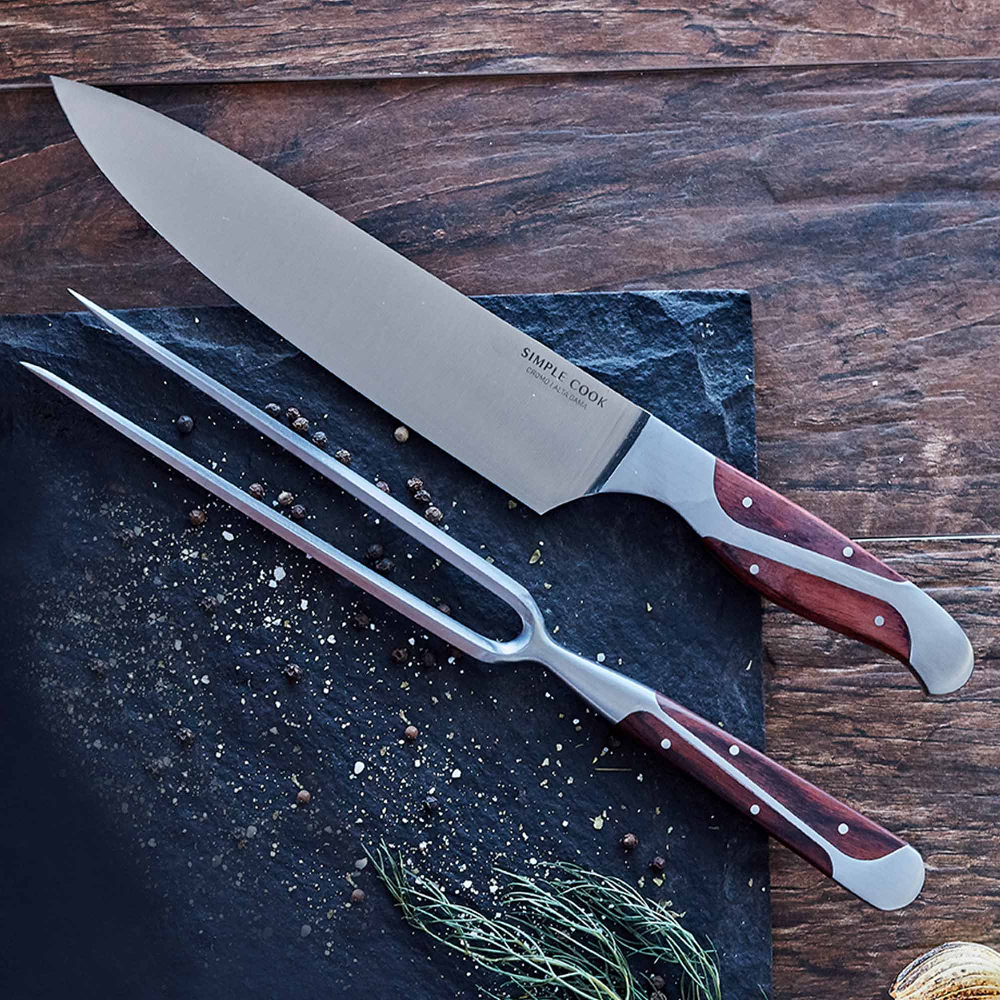 El buen asador sabe que su cuchillo y tenedor son una de las herramientas fundamentales para manejar las carnes y hacer cortes precisos, el set de utensilios para asados Texas de Simple Cook de 2 piezas es eso y más. Con su impecable diseño que comienza por acero inoxidable (5Cr15Mov) que te da una alta resistencia a la corrosión, el desgaste y aumenta la dureza y tenacidad del filo. Termina con un mango que mezcla el acero con elegante madera tipo pakka que tiene gran resistencia al calor y la humedad, manejar estas herramientas será un agrado al tacto y a la vista.