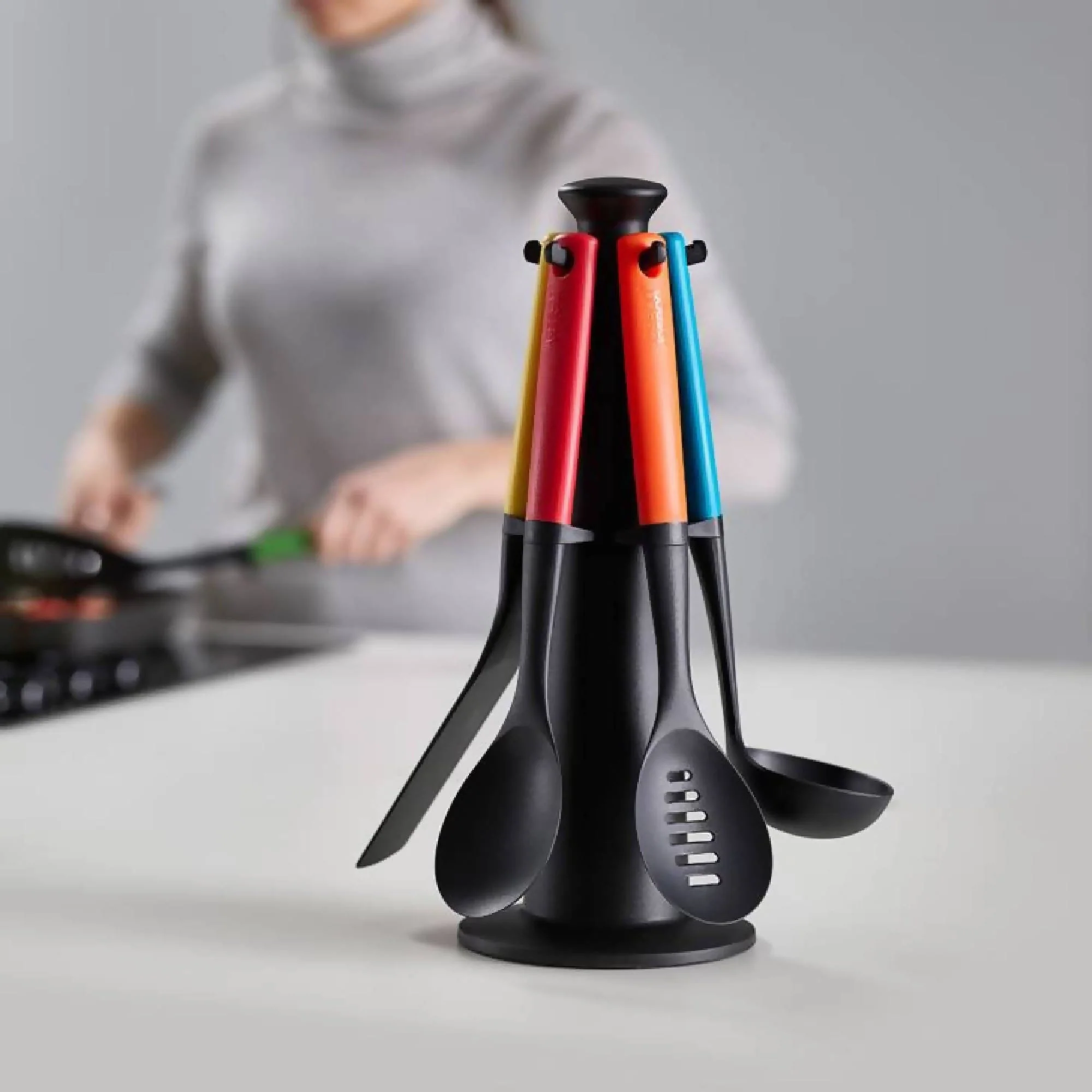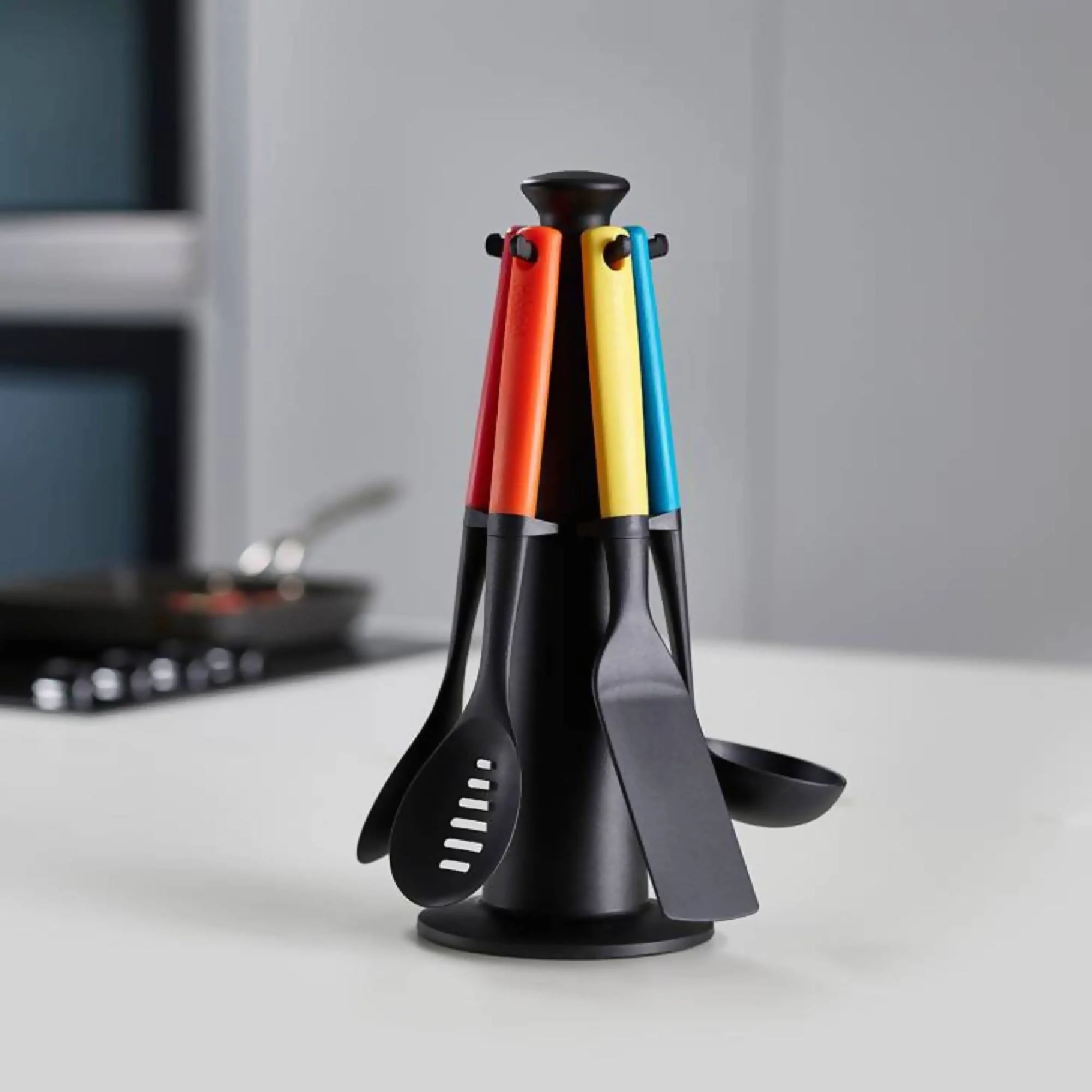El Set Utensilios Carrusel Duo Multicolor Joseph Joseph incluye 5 utensilios de cocina más un soporte para guardarlos sobre el mesón de tu cocina y poder acceder a ellos fácilmente. Incluye los siguientes utensilios:Están hechos de nylon resistente al calor hasta 200°C y tienen una pieza especial en el mango que al apoyarlo mantiene el cabezal elevado, evitando que se ensucie el mesón. Apto para lavavajillas.Medidas:- Diámetro: 16,5cm- Alto: 35cm