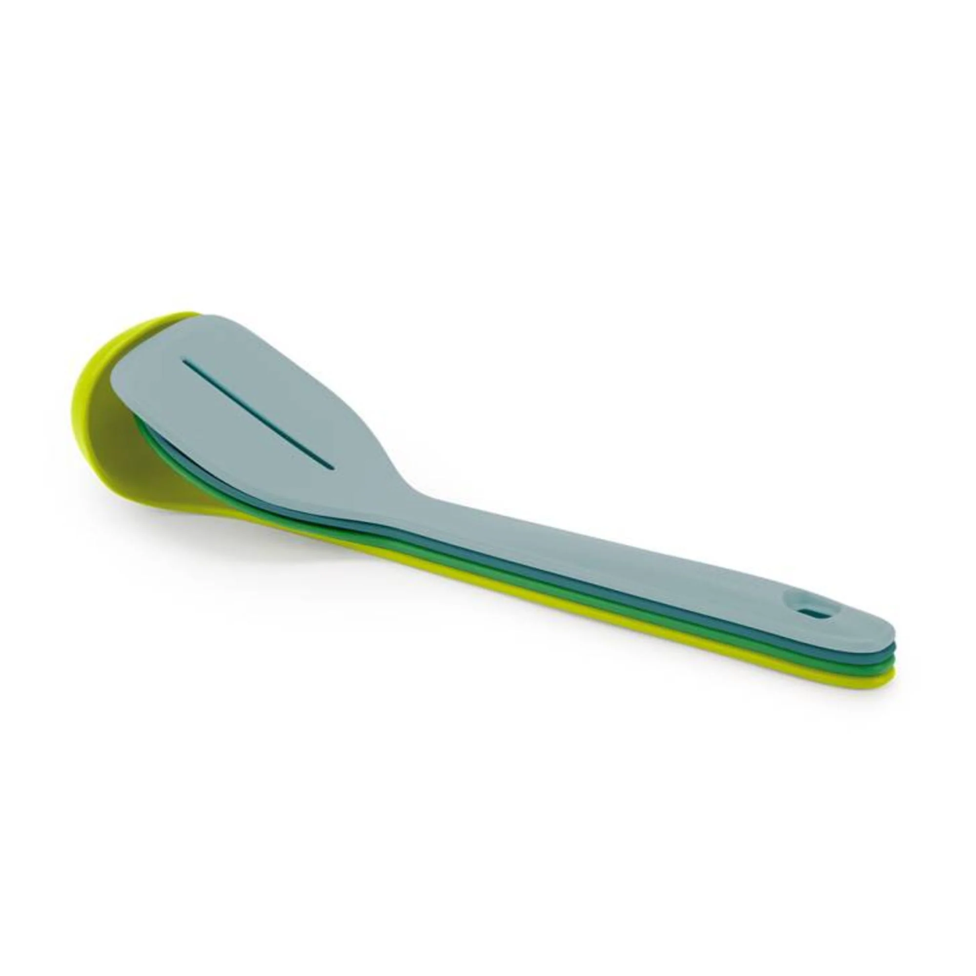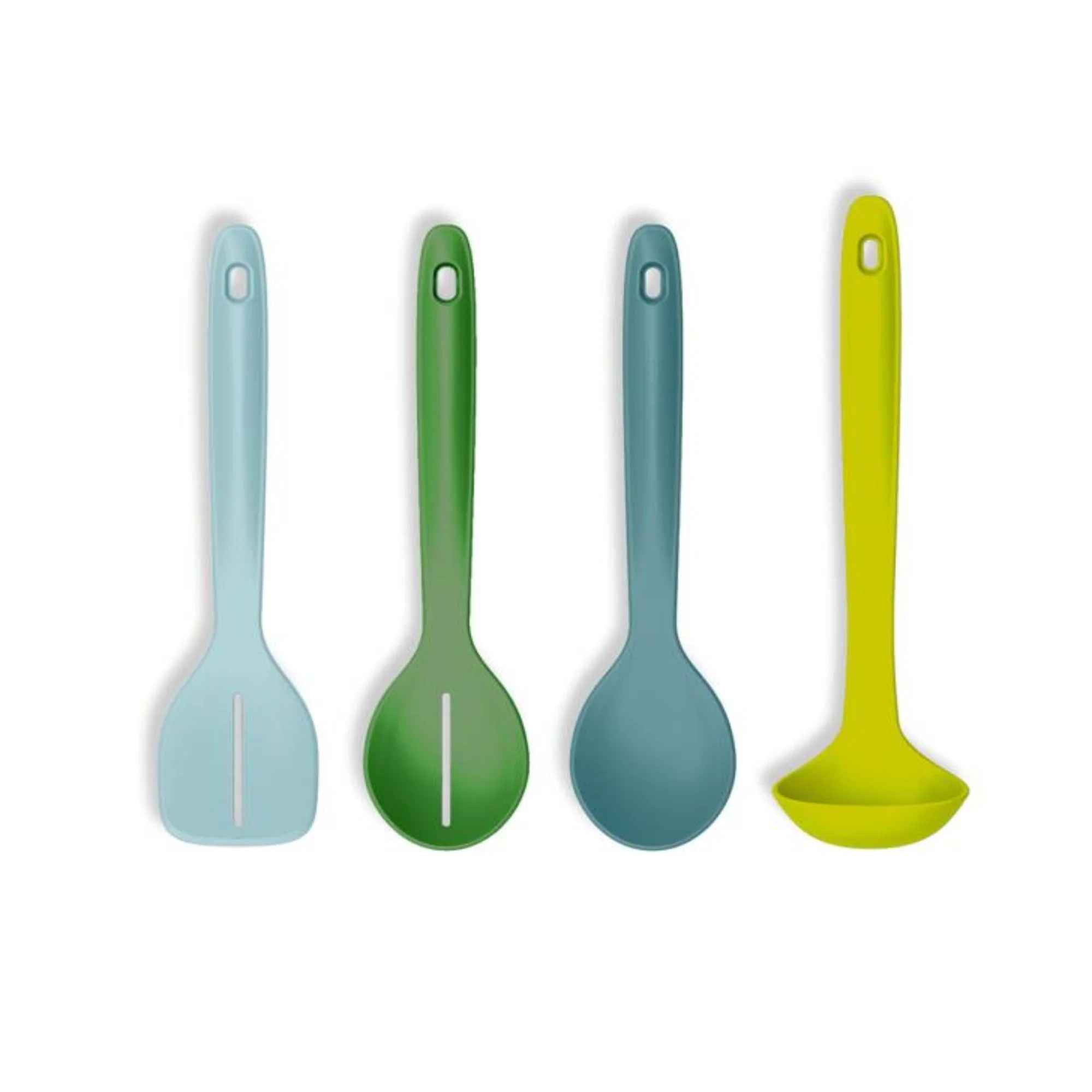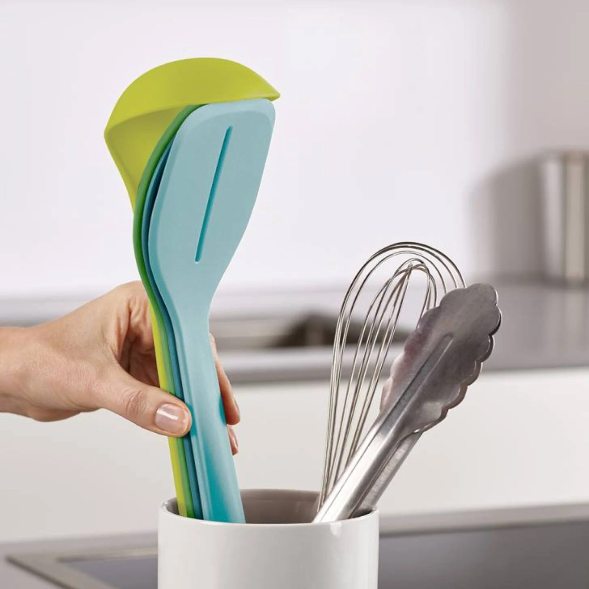 Optimiza tu espacio en la cocina con el Set de Utensilios Nest 4 Piezas de Joseph Joseph. Cada utensilio se guarda de forma compacta dentro del otro, ahorrando espacio de almacenamiento. Este set incluye una espátula con ranura, una cuchara con ranura, una cuchara sólida y un cucharón, cubriendo todas tus necesidades culinarias. Fabricados para resistir hasta 200°C, estos utensilios son duraderos y seguros para su uso en diferentes tipos de cocción. Con el Set de Utensilios Nest, tendrás todo lo que necesitas al alcance de tu mano, de manera ordenada y eficiente.