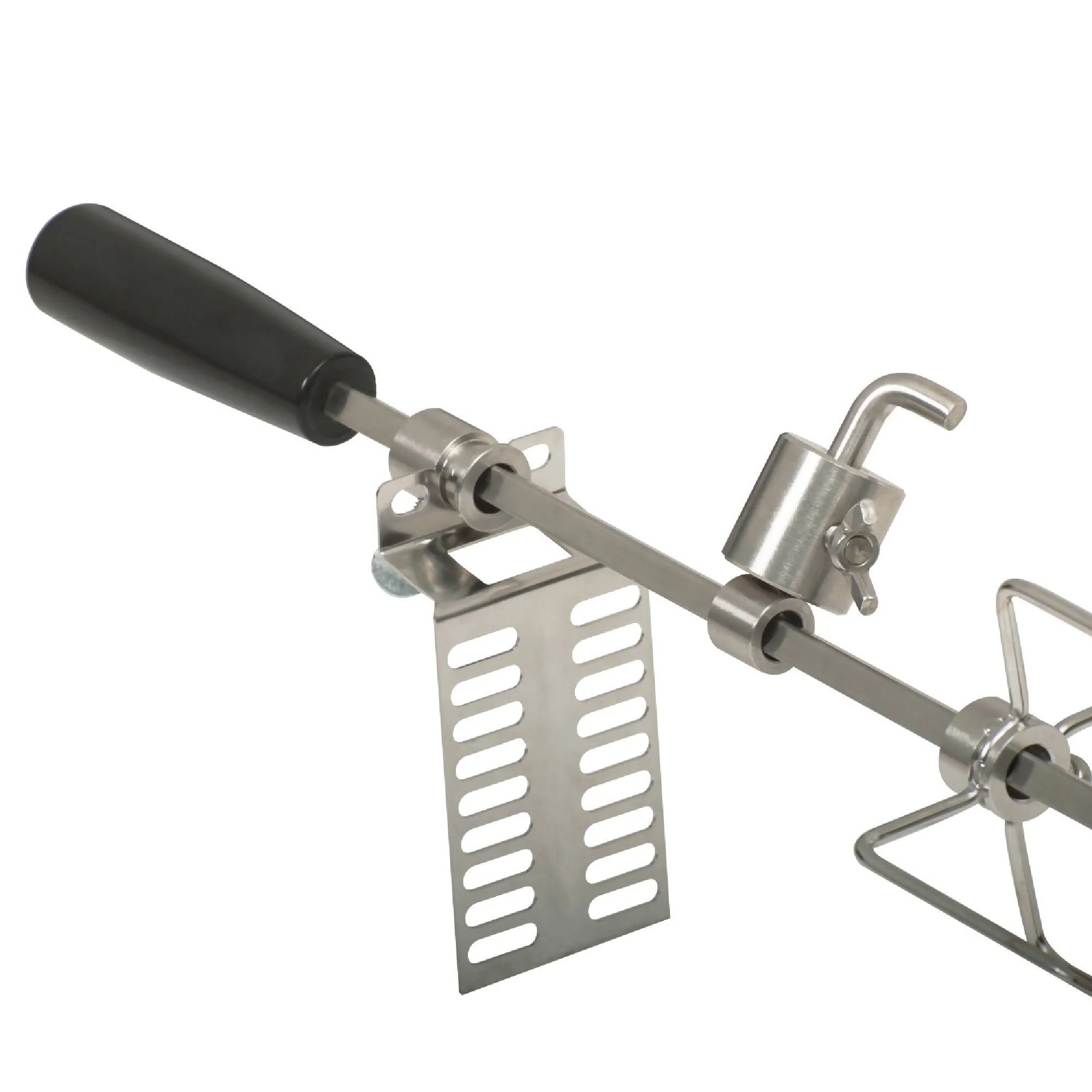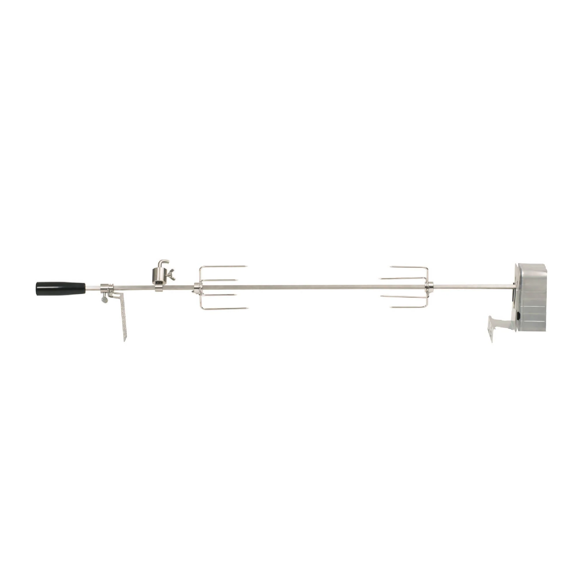 Spiedo híbrido de 90 cm para parrillas, puede ser utilizado con pilas o electricidad, lo que lo hace útil tanto para su uso en casa o para ir de camping, ideal para asar de manera uniforme tus carnes.
