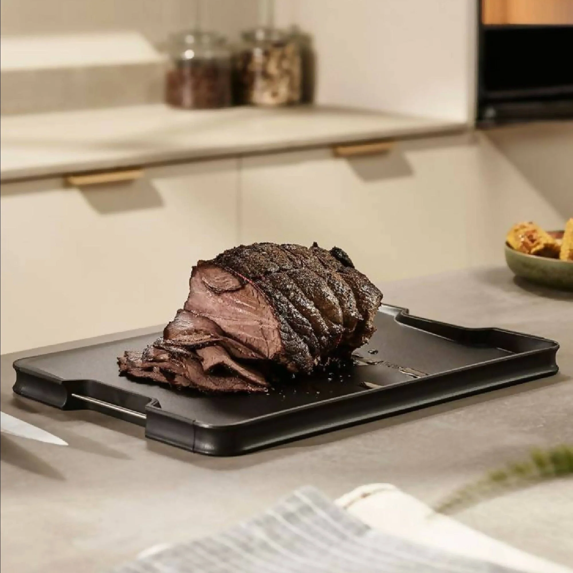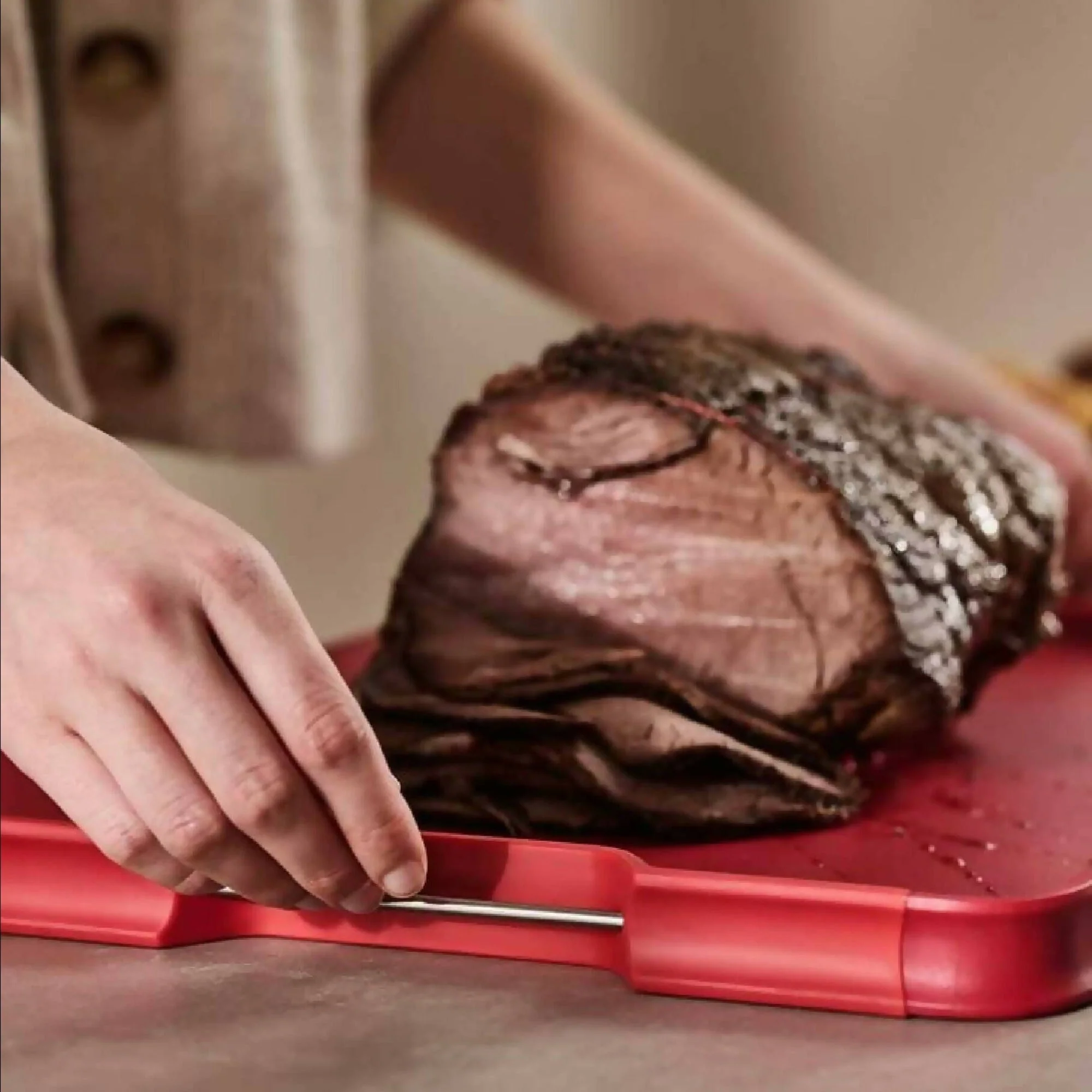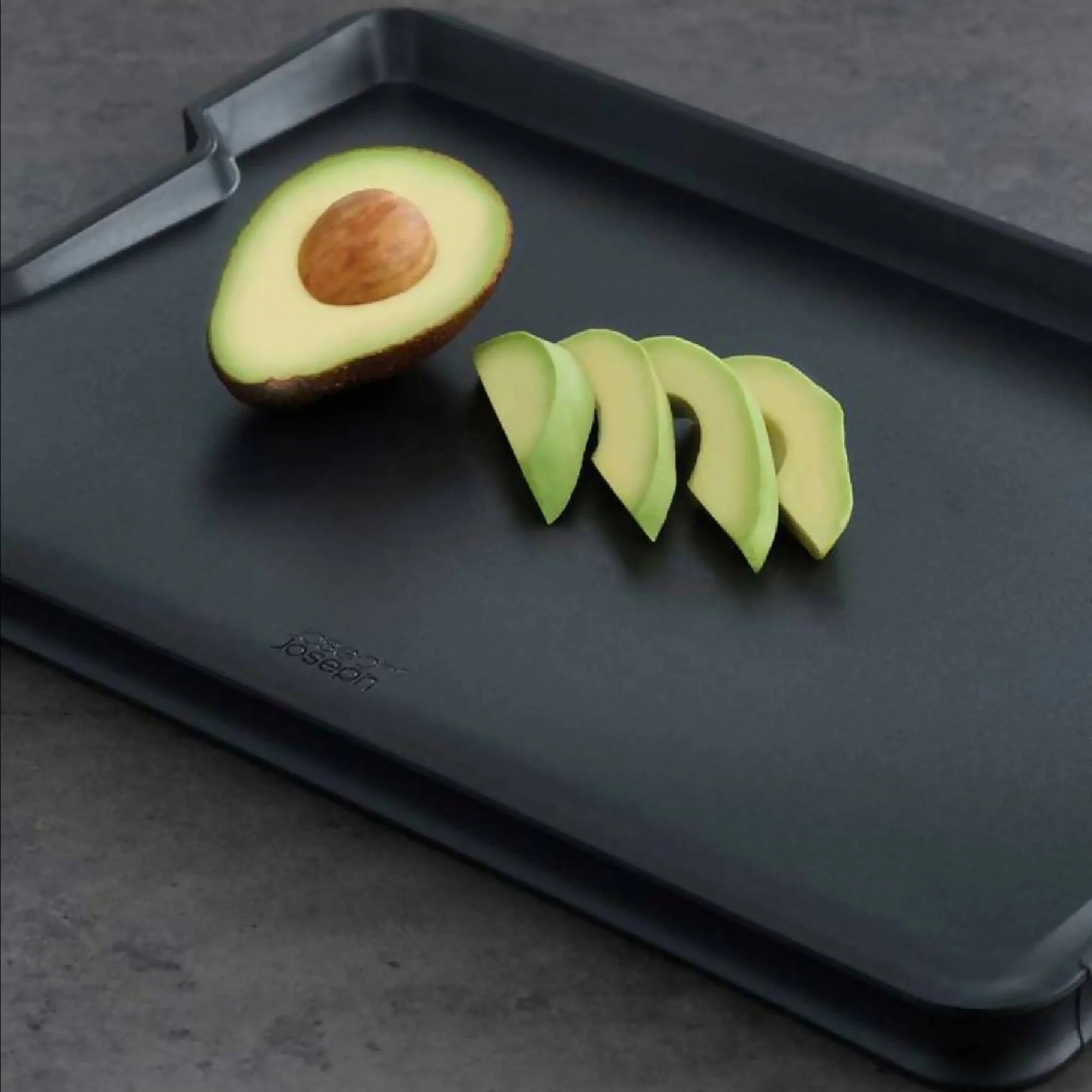 La Tabla Multifunción Plus L Joseph Joseph tiene 2 lados con distintos propósitos. El lado liso sirve para cortar y preparar todo tipo de ingredientes. El lado opuesto tiene puntas en el centro que ayudan a afirmar la carne para poder cortarla. Además, su superficie en ángulo y bordes altos ayudan a recolectar el jugo de la carne y verterlo fácilmente gracias a sus esquinas redondeadas. Por último, tiene mangos de acero inoxidable, borde de goma antideslizantes y es apta para lavavajillas.