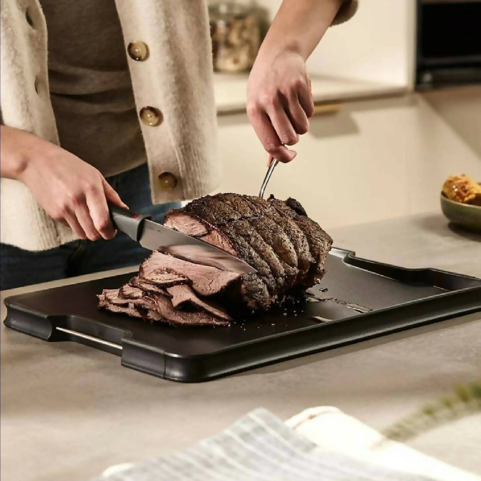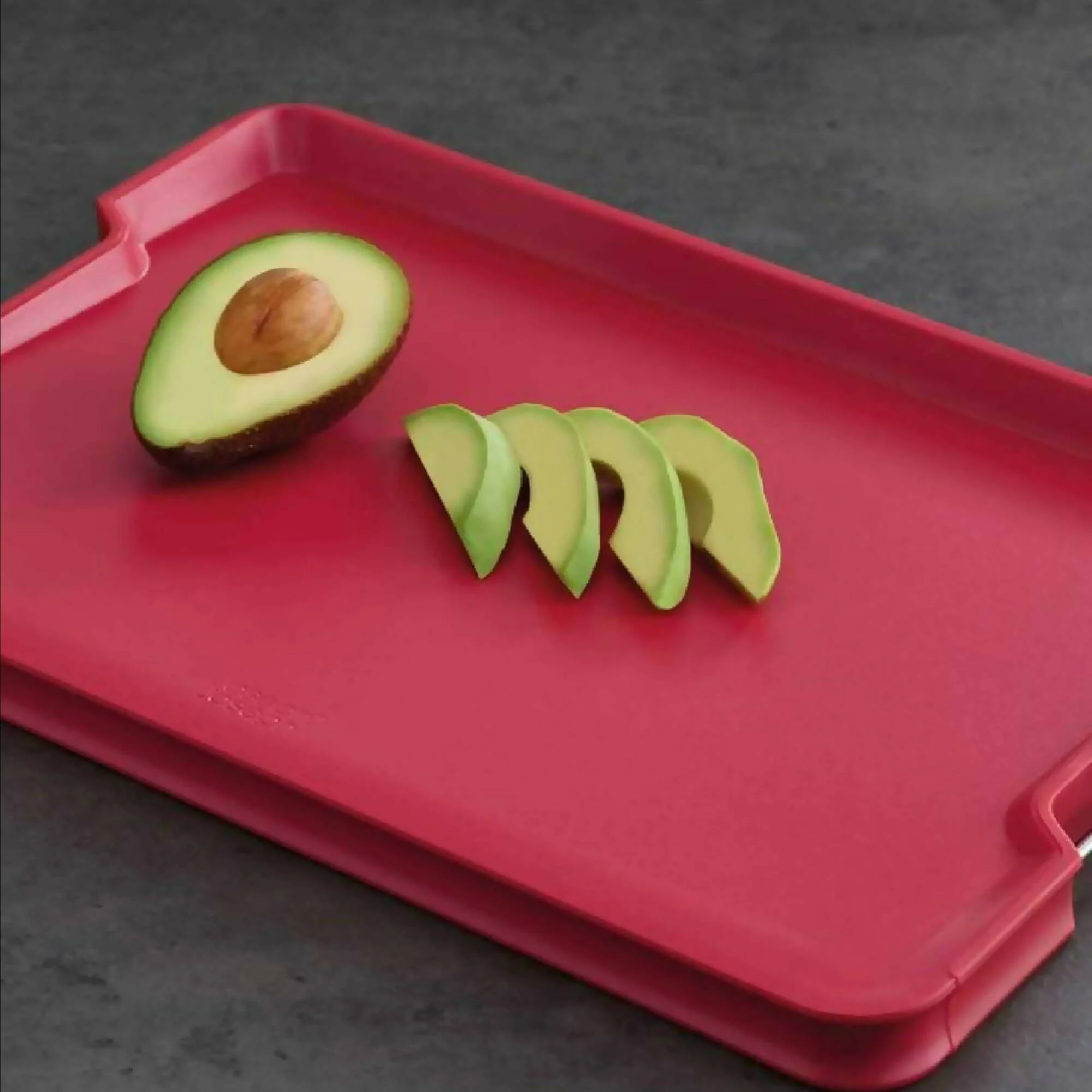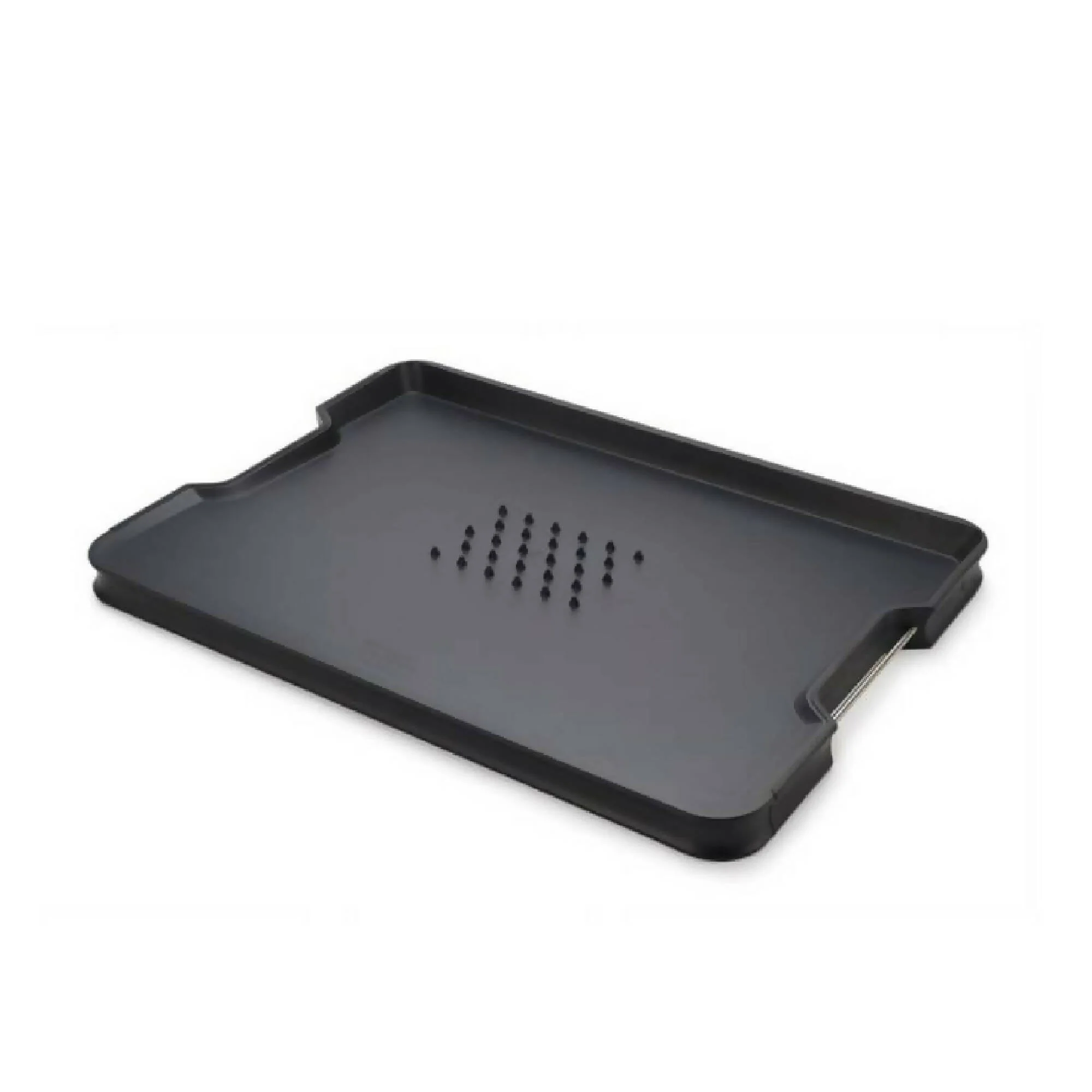 La Tabla Multifunción Plus XL Joseph Joseph tiene 2 lados con distintos propósitos. El lado liso sirve para cortar y preparar todo tipo de ingredientes. El lado opuesto tiene puntas en el centro que ayudan a afirmar la carne para poder cortarla. Además, su superficie en ángulo y bordes altos ayudan a recolectar el jugo de la carne y verterlo fácilmente gracias a sus esquinas redondeadas. Por último, tiene mangos de acero inoxidable, borde de goma antideslizantes y es apta para lavavajillas.