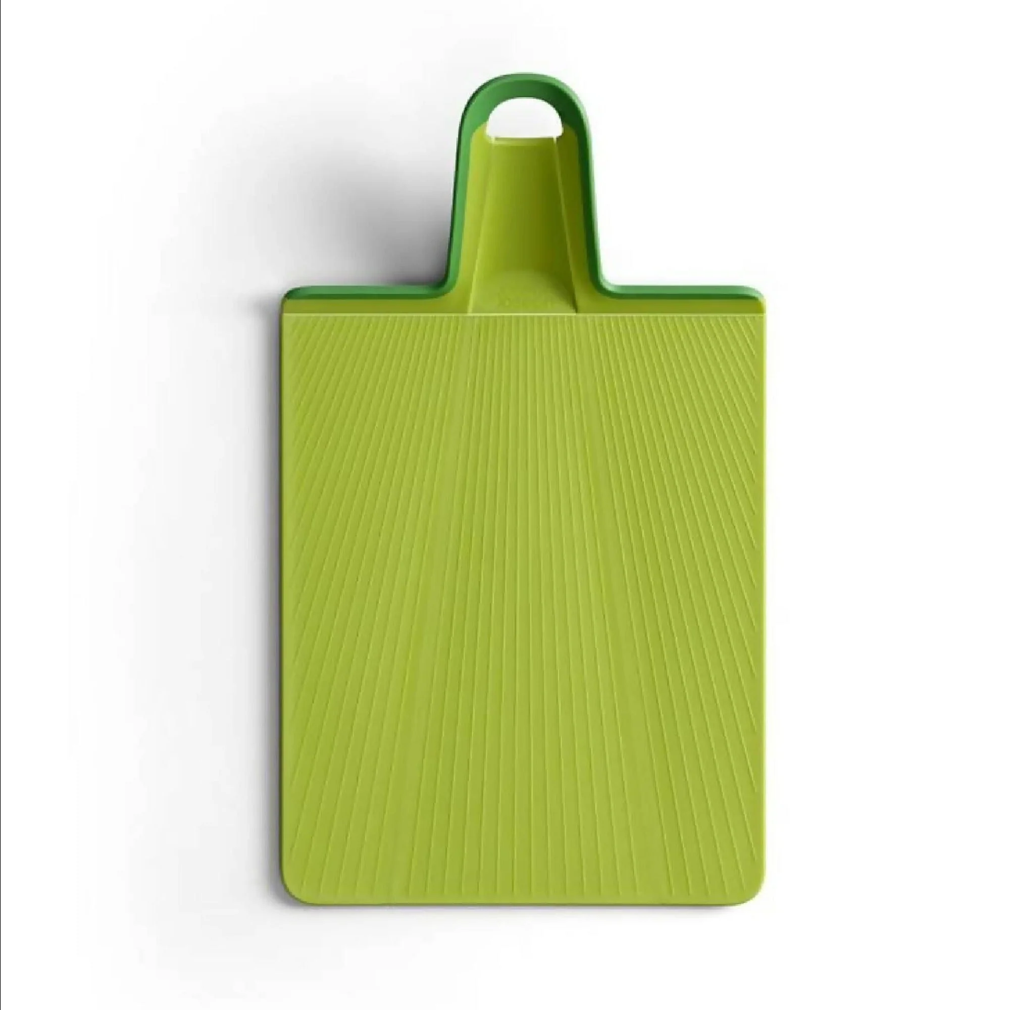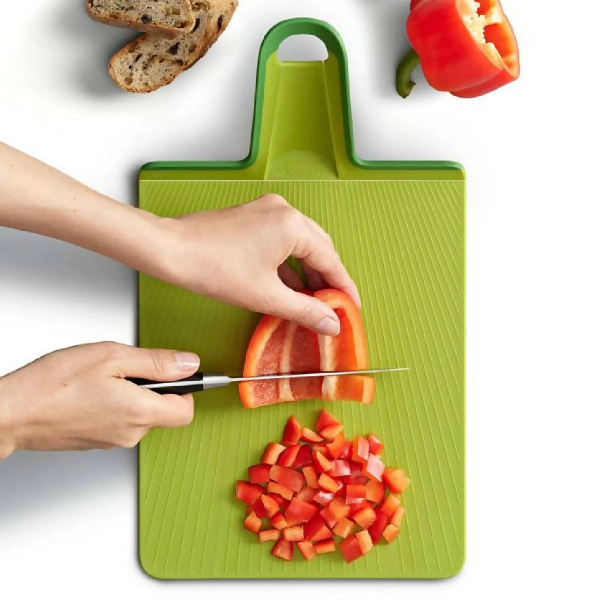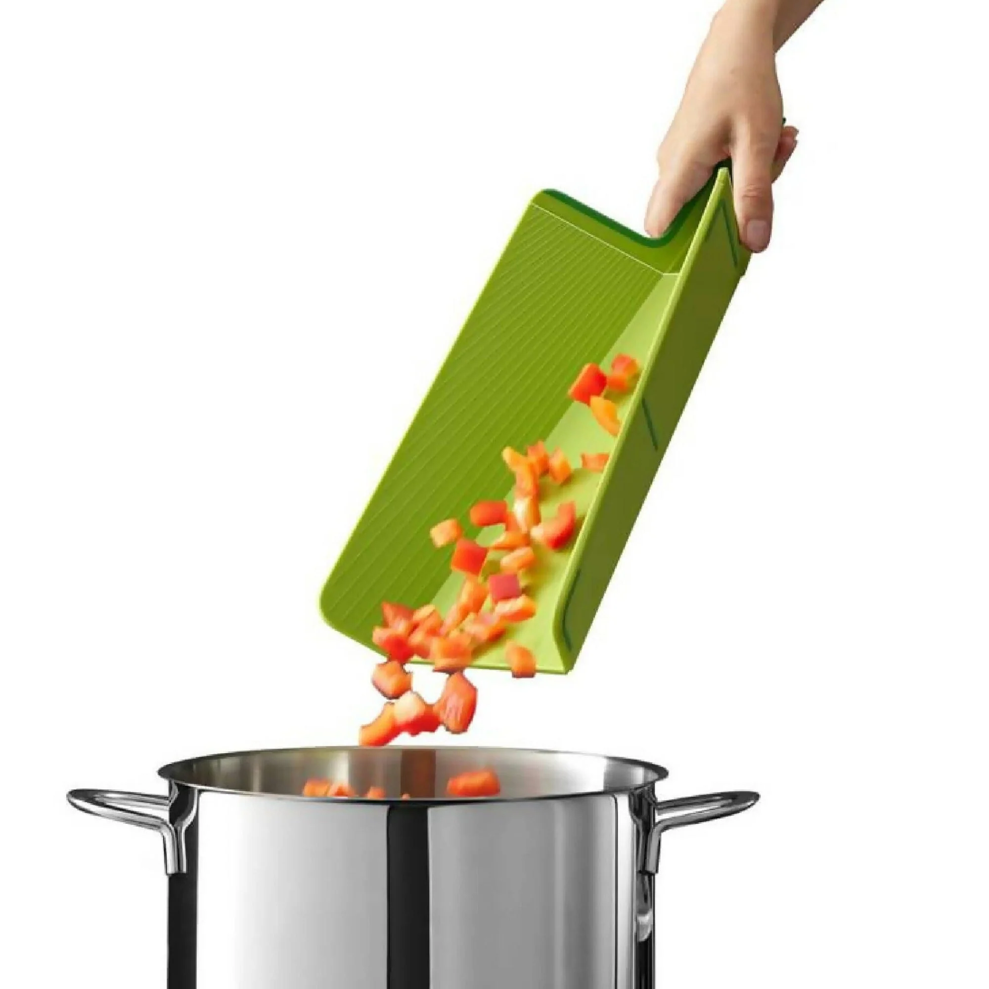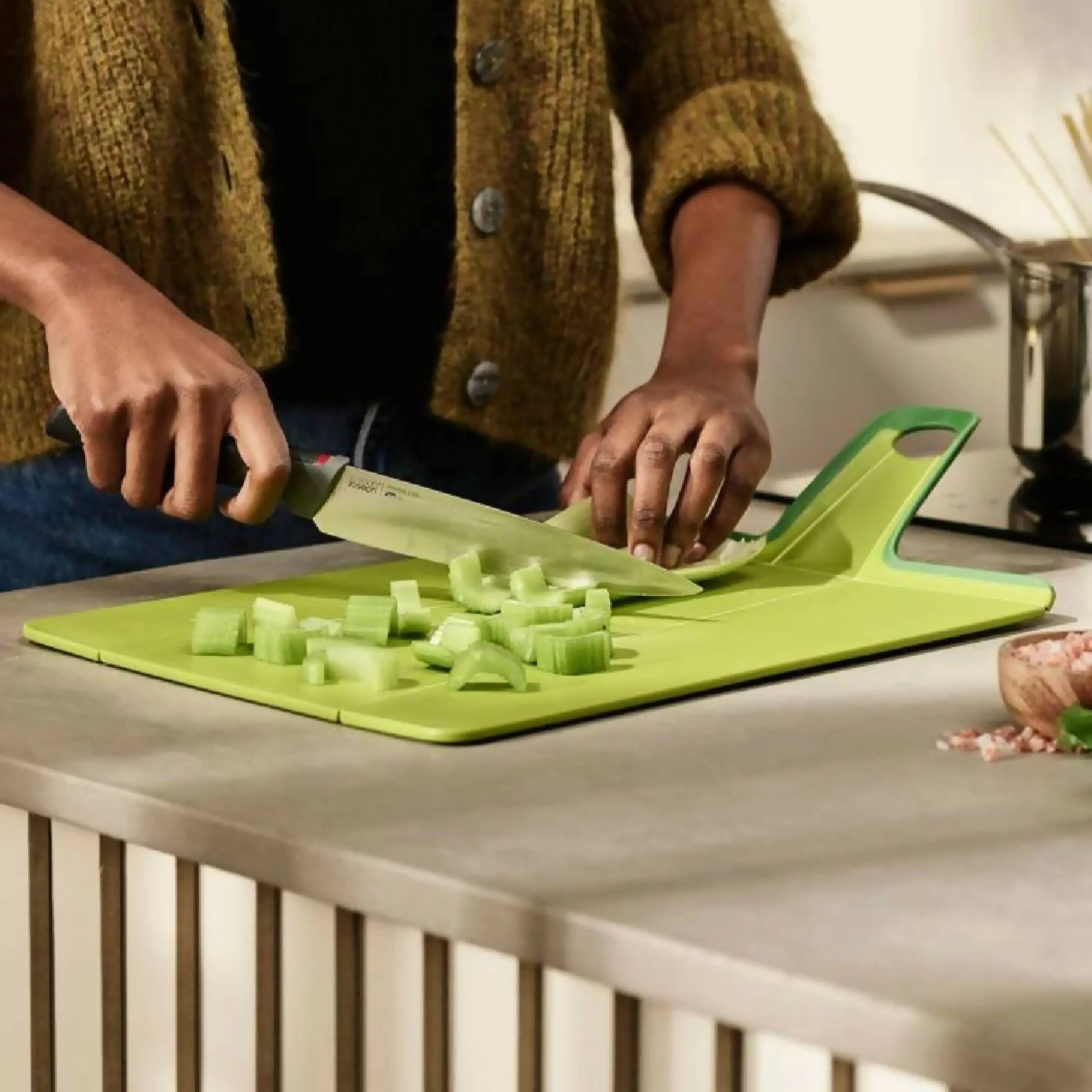 La innovadora Tabla Plegable Plus M Verde Joseph Joseph es la solución que necesitas para verter tus ingredientes cortados directamente a la olla o bowl. La tabla tiene una superficie texturizada antideslizante que cuida el filo de tus cuchillos. Al apretar el mango, los lados de la tabla se doblan, creando un canal que facilita el vaciado de los ingredientes cortados directamente a la olla, sartén o bowl. También es perfecto para tirar las cáscaras directamente a la basura. Tiene topes antideslizantes para evitar que la tabla se mueva al cortar. Apta para lavavajillas.