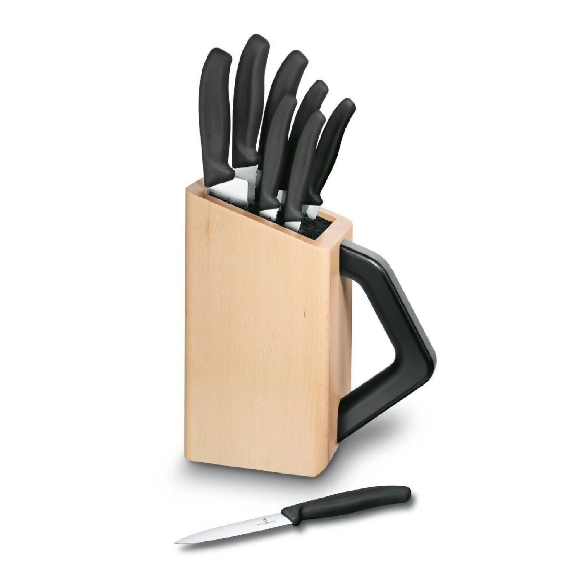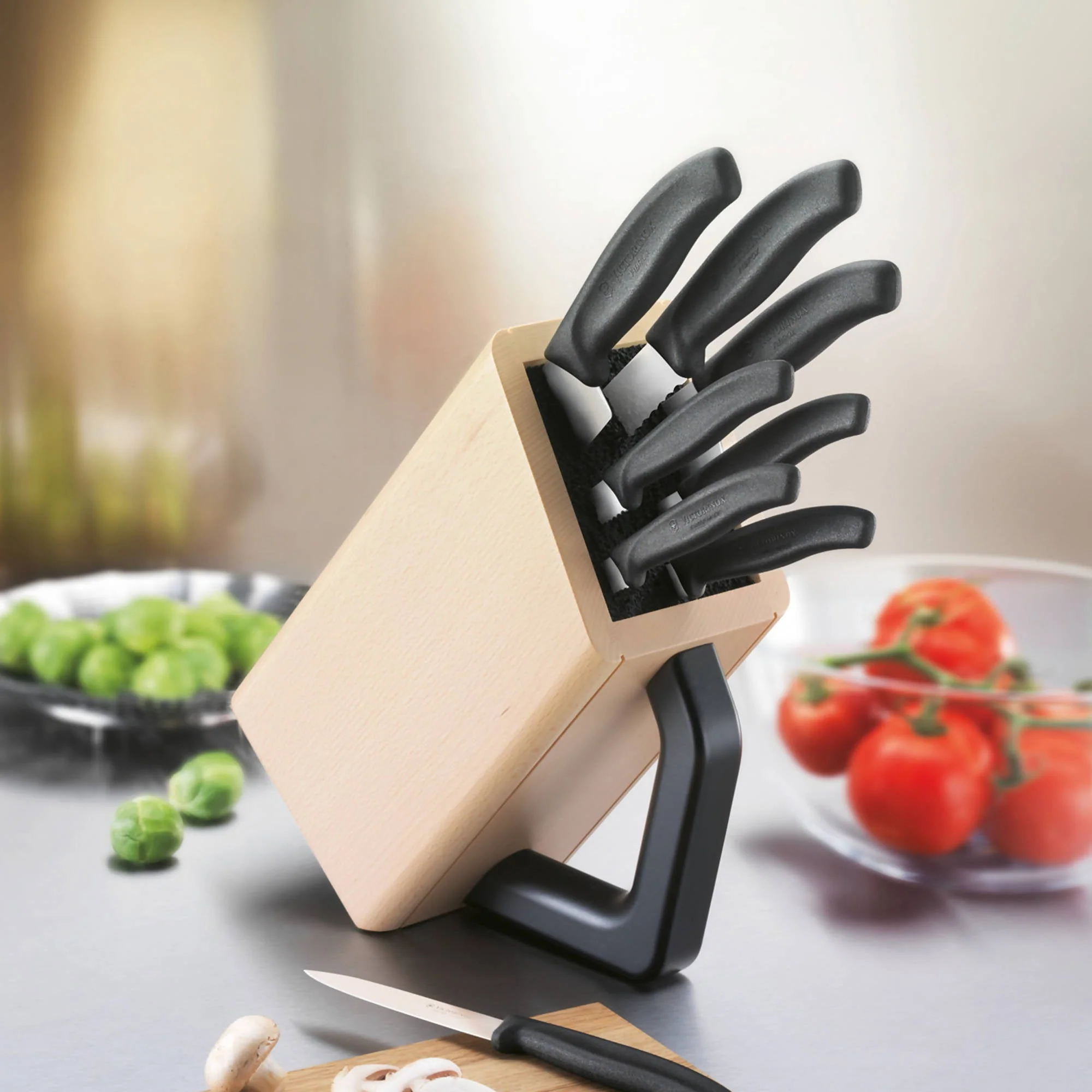 Las cocinas puntuales saben que el minimalismo natural es estético para todos los tiempos. Presentamos nuestro bloque para cubiertos Swiss Classic, 8 piezas, una adición elegante a cualquier mostrador. De tamaño compacto, de naturaleza creativa, es un potente motor al alcance de su mano. Con ocho cuchillas de alta precisión, ayuda a todos los cocineros a mejorar su juego culinario con su afilada mezcla heterogénea de cuchillos para cortar, cortar en cubitos, pelar y trinchar. Contiene: Cuchillo para bistec Swiss Classic, filo dentado, 11 cm, negro. Cuchillo mondador Swiss Classic, filo dentado, 8 cm, negro. Cuchillo mondador Swiss Classic, punta centrada, 8 cm, negro. Cuchillo mondador Swiss Classic, punta centrada, 10 cm, negro. Cuchillo de mesa y para jitomates Swiss Classic, filo dentado, 11 cm, negro. Cuchillo para trinchar Swiss Classic, 19 cm, negro. Cuchillo Santoku Swiss Classic con filo con alveólos, 17 cm, negro. Cuchillo para pan Swiss Classic, filo dentado, 21 cm, negro.