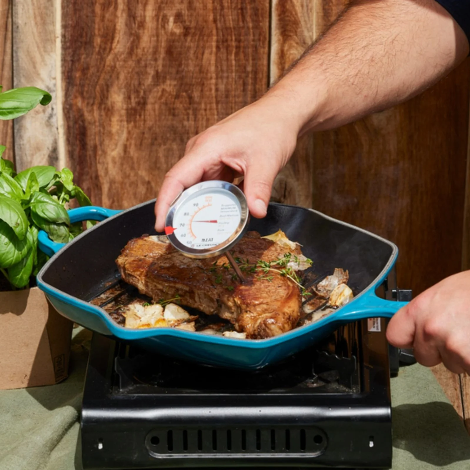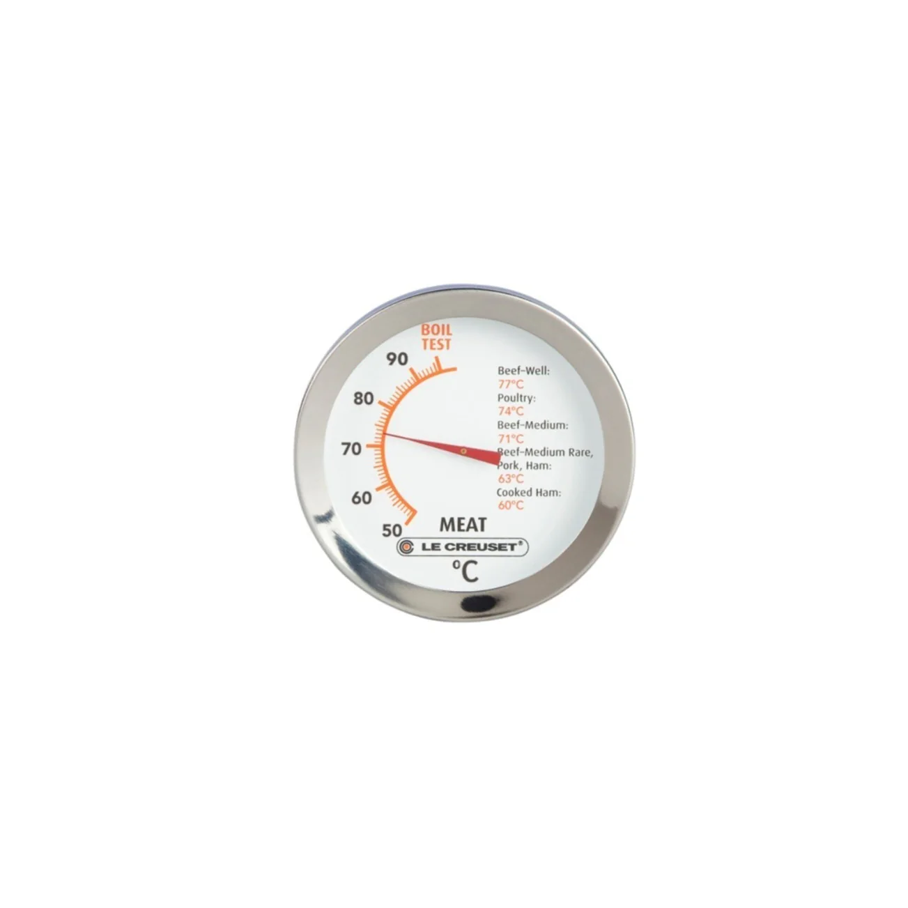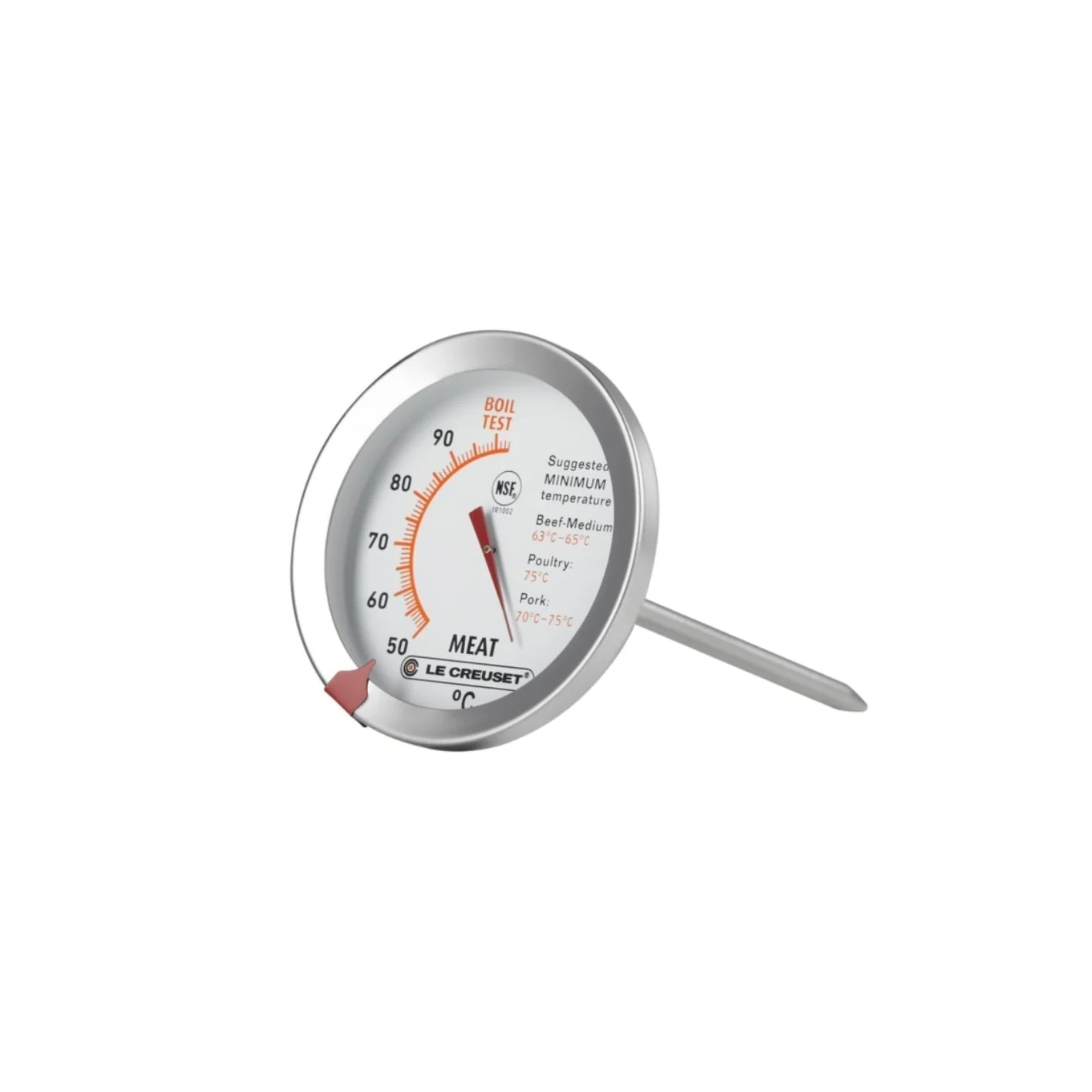 Cocina con precisión utilizando el termómetro para carne de Le Creuset. La sonda de acero inoxidable permite medir la temperatura interna de la carne con rapidez y exactitud. Su esfera de lectura fácil muestra temperaturas de 50 a 100 ºC e incluye referencias de temperaturas internas recomendadas para distintos tipos de carne. Para obtener una lectura precisa, inserta la sonda al menos 4 cm de profundidad. Este termómetro es una herramienta esencial para lograr el punto de cocción perfecto en tus platos, garantizando resultados deliciosos y seguros.