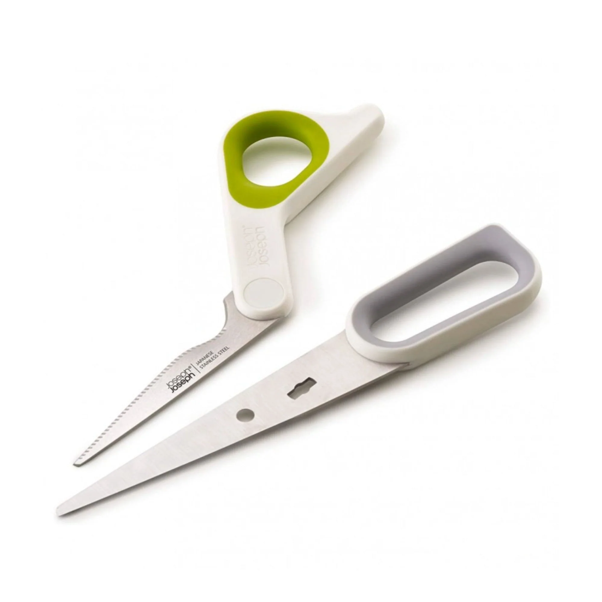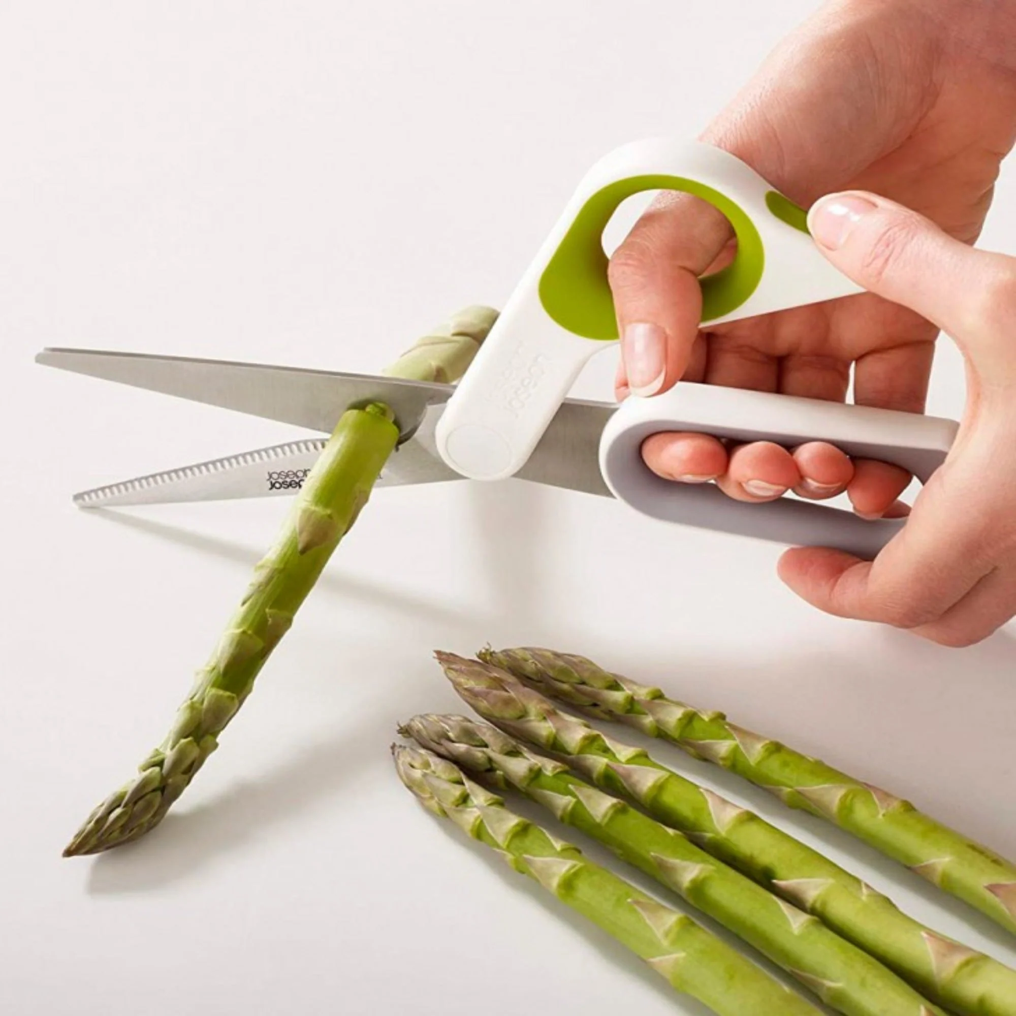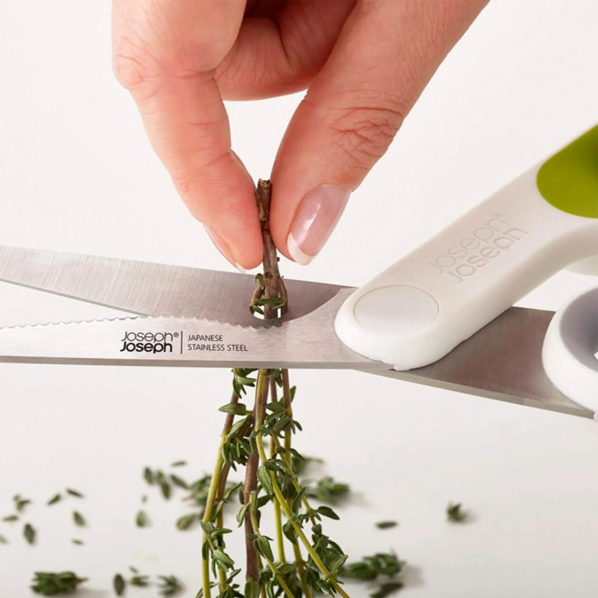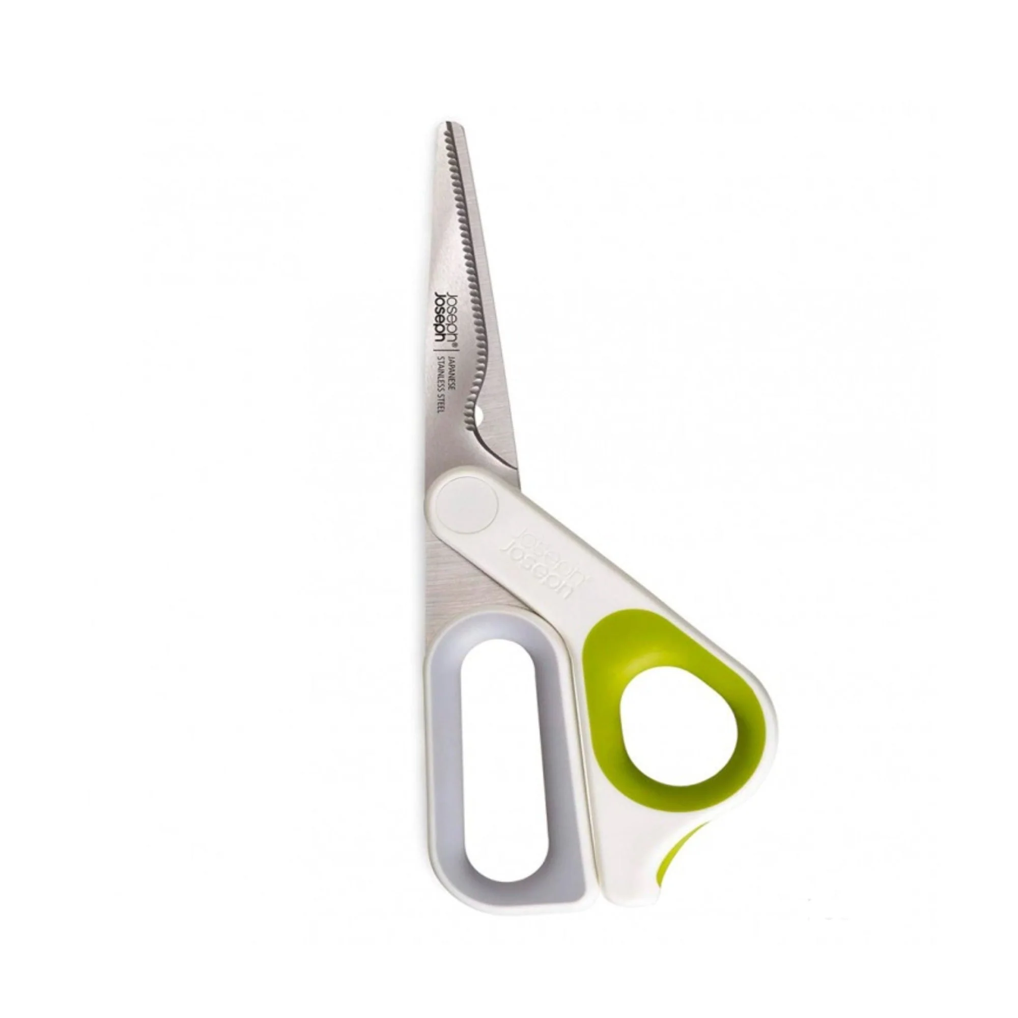La Tijera Multiuso Joseph Joseph tiene una hendidura donde puedes apoyar el pulgar cuando necesites hacer fuerza para cortar elementos más duros como palos de borchetas o huesos de pollo. También tiene un agujero por donde puedes pasar las hierbas para sacarles las hojas. Tiene un filo normal y uno de sierra hechos de acero inoxidable japonés y se desarma para poder lavarla con facilidad.